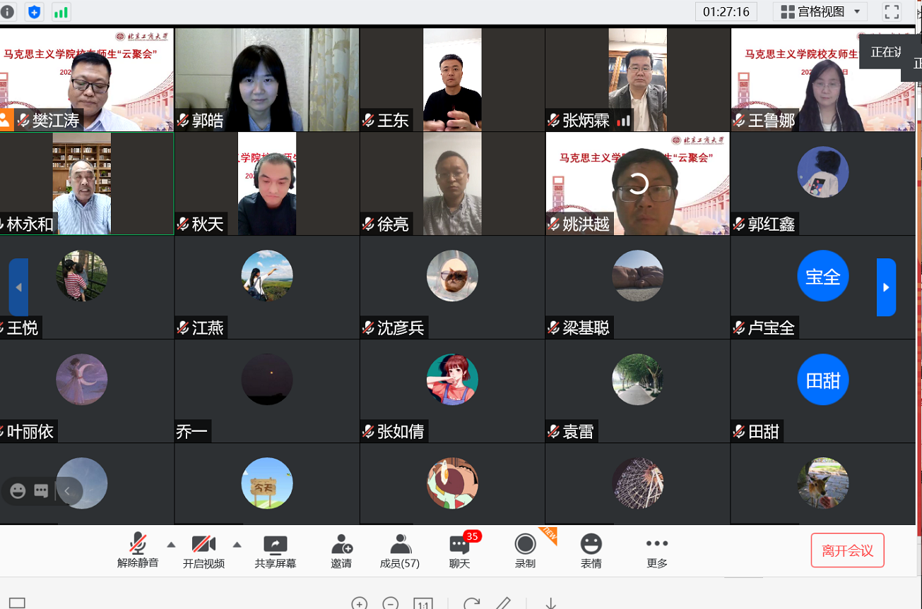 在我校70周年华诞和国庆节假期双喜临门之际,马克思主义学院于10月7日晚,以“祝福母校,携手同窗,笑掷流年,奋斗青春”为主题,召集祖国四面八方的校友师生云端聚会,畅叙师生情、同窗谊,以真诚交流的方式了解学校学院发展状况,汇报各自成长和奋斗的故事,向母校70年校庆献礼。学院领导班子、部分教师、退休教师、校友以及在校生共60余人参加了活动。