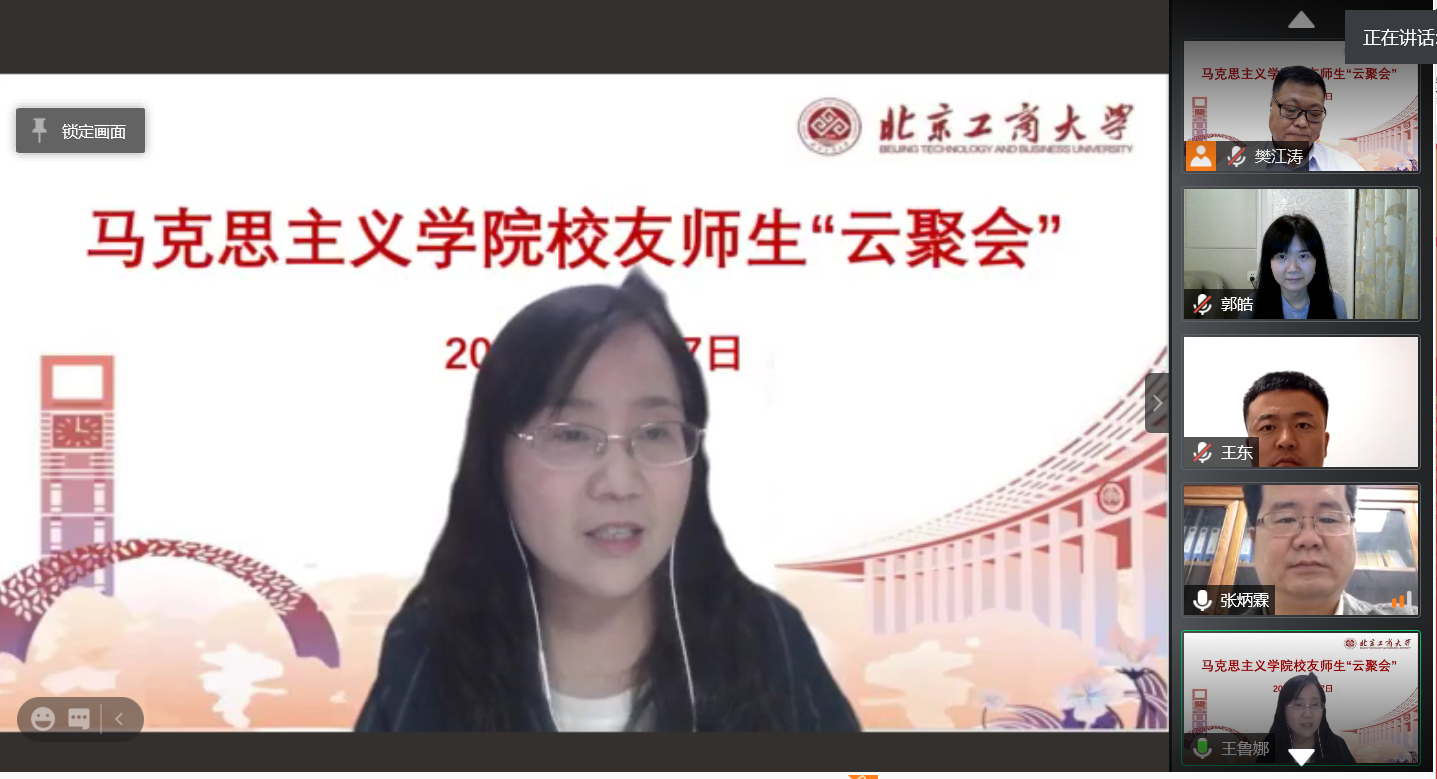 活动中还展示了北京工商大学校歌和马克思主义学院院徽,校友师生线上共唱校歌,在雄壮的校歌声中,“云聚会”圆满结束,校友们纷纷线上留言,祝福母校发展壮大,祝福老师桃李满天下。