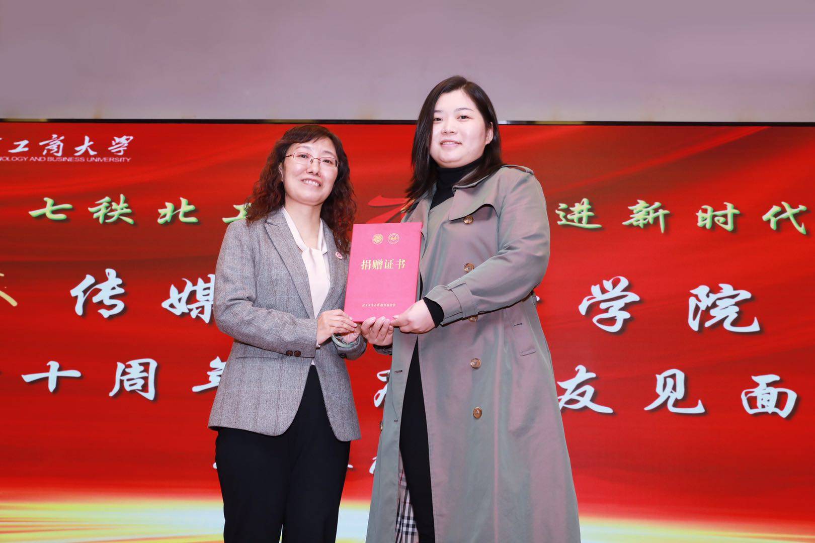 为支持学院教育事业的发展,广设101班校友刘陈晨向学院捐赠10万元,用于设立传媒与设计学院晨曦奖学金奖励优秀学生,学院党委书高丽华向刘陈晨颁发了捐赠证书。为感谢师恩,校友们为老教师和教授们送上鲜花表达感谢。大会在合唱校歌中落下帷幕。