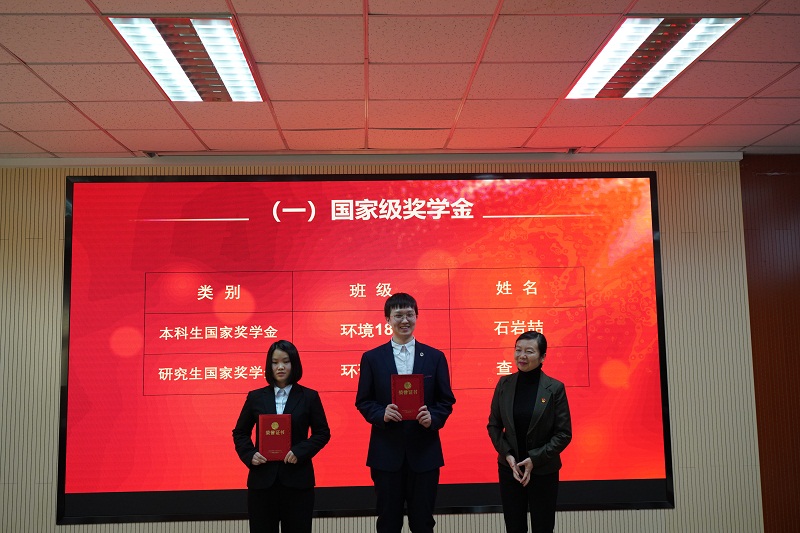 国家奖学金获得者、环境182班石岩喆发言,他从健康的体魄、学习与能力关系、人格与道德品质、机遇和挑战等方面分享了在校期间的感悟,鼓励学弟学妹们勤奋学习,不负韶华,书写属于自己的人生篇章。环境202吴茜伦作为新生代表发言,她代表新生对获奖学长学姐们表示祝贺,表示会坚定信念,努力学习专业知识,积极参加环保宣传与科普,以学长学姐们为榜样,努力学习,不负期望,担起时代重任。