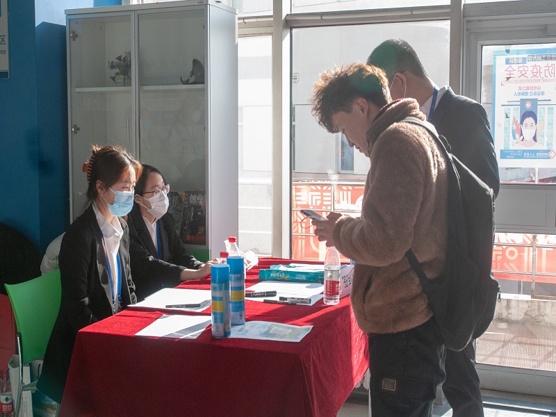 双选会开始前,求职毕业生在场地外排队等候入场,此次参加双选会的同学不仅有大四的毕业生,也有低年级同学。双选会期间,同学们挑选心仪的职位,将精心准备的简历投向心仪公司,部分单位门前排起了长队,现场气氛热烈。