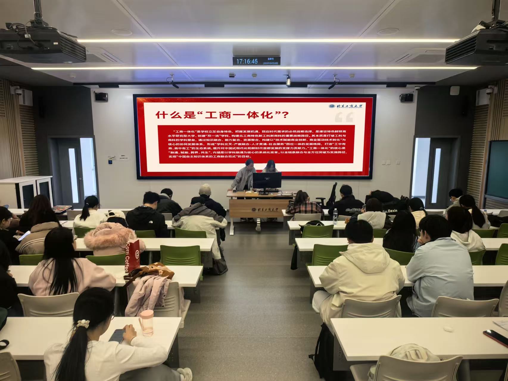 在两会精神学习篇,班主任带领各班学生,结合政府工作报告中的“制造强国”“教育强国”“人工智能+”等关键词,向同学们解读了2025年全国两会精神。经济学院、商学院与数字书院各班聚焦两会提出的高质量发展与新质生产力,引导学生关注国家经济布局,深入思考未来发展方向。轻工科学与工程学院各班围绕“制造强国”战略,鼓励同学们主动探究如何以专业能力服务国家战略需求。法学院、食品与健康学院、计算机与人工智能学院各班分别围绕法治建设、健康中国与“人工智能+”等主题,通过分组讨论和专题研讨相结合,引导学生将个人未来发展与国家需求紧密结合。数学与统计学院各班重点学习了数字经济和教育数字化,提高了学生对数字化转型重要性的认识。语言与传播学院各班深入探讨了“人工智能+语言服务”的创新路径和未来发展趋势。设计与艺术学院围绕乡村振兴与绿色发展主题,引导学生从两会政策中把握时代方向,增强服务首都四个中心建设的主动性与责任感。
