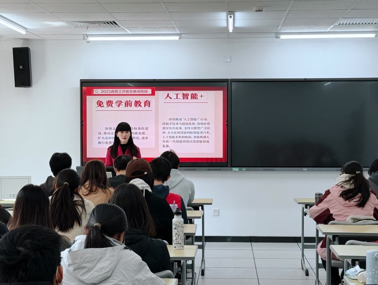 为深入学习贯彻2025年全国两会精神,全面了解我校“工商一体化”发展理念,学生处组织各学院全覆盖开展“学习两会精神,领悟‘工商一体化’”主题班会。