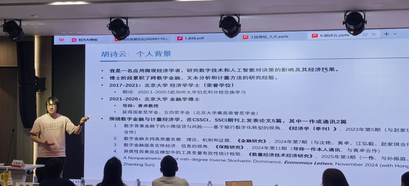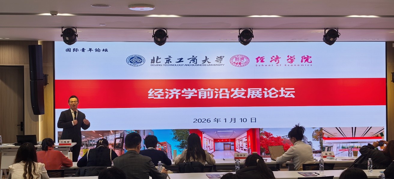 1月10日,北京工商大学经济学院2026年国际青年学者论坛在阜成路校区举办。来自北京大学、清华大学、中国人民大学、中国社会科学院大学、南开大学、山东大学、对外经贸大学、北京邮电大学和中国人民银行金融研究所的18位优秀青年学者参加本次论坛。经济学院执行院长詹新宇教授、副院长牛晓燕教授,贸易经济系主任梁鹏教授、李丽教授,国际经济与贸易系主任郭志超副教授,金融系主任郭娜副教授,风险管理与保险学系副主任赵艳副教授,财政系主任邓磊副教授参加论坛研讨活动。