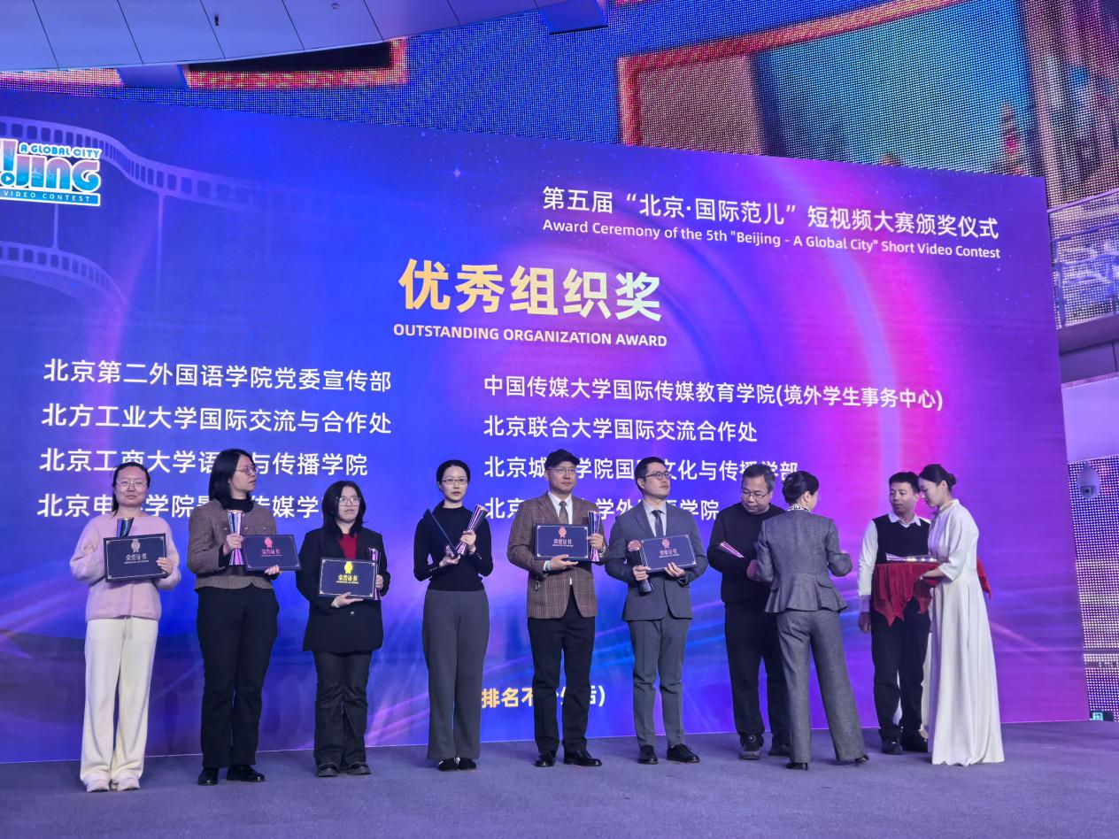 本次大赛由北京市委外办市政府外办主办,中新社国际传播集团有限公司北京分公司承办,中联部信息传播局、外交部新闻司作为指导单位。“北京·国际范儿”短视频大赛自启动以来,始终面向广大北京市民、热爱北京文化的外籍友人以及在京各类机构开放征集,邀请大家用镜头记录京城风貌,用影像传递友好故事。大赛广泛吸纳来自不同视角、不同文化的短视频作品,鼓励参与者深入城市的肌理,捕捉日常生活中那些动人而真实的瞬间。学院在本次大赛中获得优秀组织奖,青年教师樊安懿代表学院上台领奖。