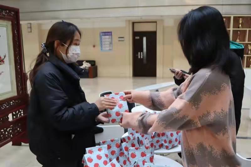 在考研学子们仍在抓紧最后的时光紧张复习之际,商学院心资部的同学们早早来到商楼大厅为家庭经济困难的考研学子们精心准备小礼袋。画满红苹果的蓝白相间小礼袋里装着又大又红的苹果和一张满载着祝福语的卡片。苹果有着放“苹”心态、“苹”稳上岸、一定能“果”线的寓意,寄托着学弟学妹们对考研学子的祝福;卡片上写有大家精心准备的鼓励话语,言语间希望这些考研的学长学姐们能摘取胜利的桂冠,不负过去伏案桌前、泛舟书海的自己。