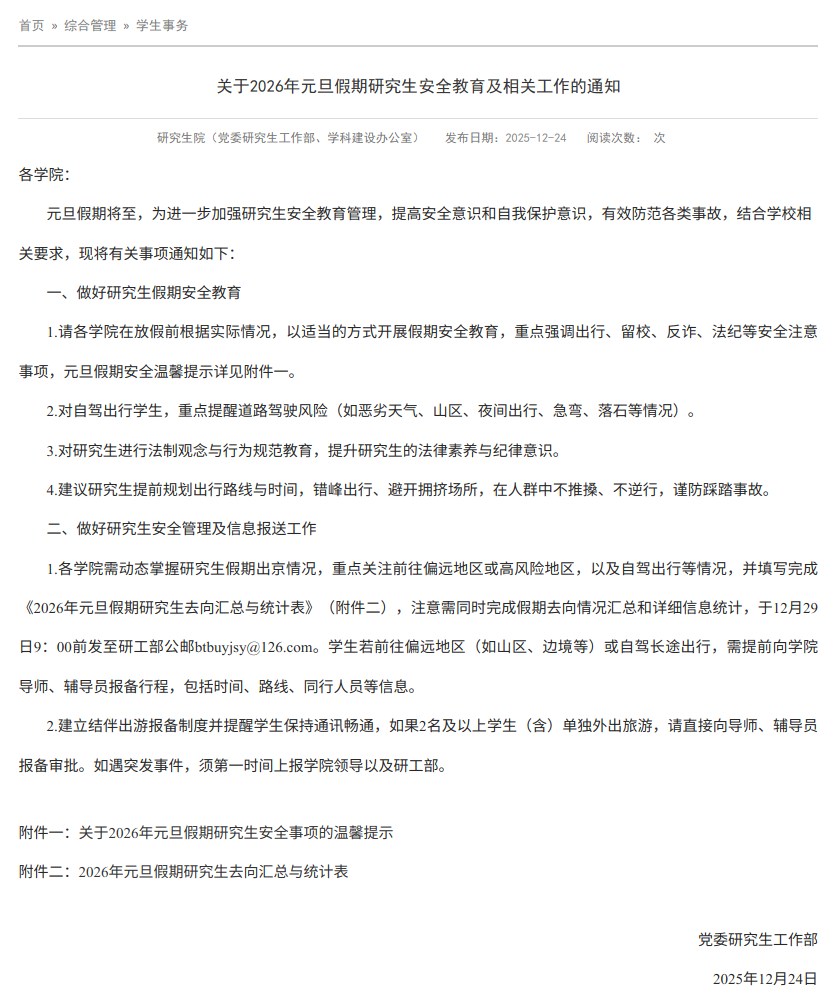 坚持安全教育“常抓不懈、警钟长鸣”。研工部在统筹研究生日常管理中,注重“精准化”提醒与服务,针对寒暑假、清明、中秋、国庆等关键时间节点,提前发布节假日安全提示及指引。如寒暑假侧重出行交通及财产安全,清明期间强调文明祭扫与防火安全,中秋国庆严格执行研究生离校去向登记制度,并要求前往山区或自驾出行者向导师和学院“双报备”。全年无间断的安全教育与警示提示,确保了安全意识的持续在线、不断提升。