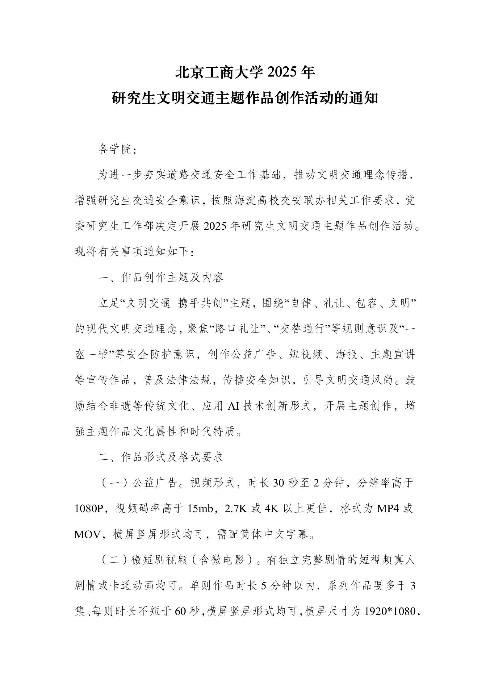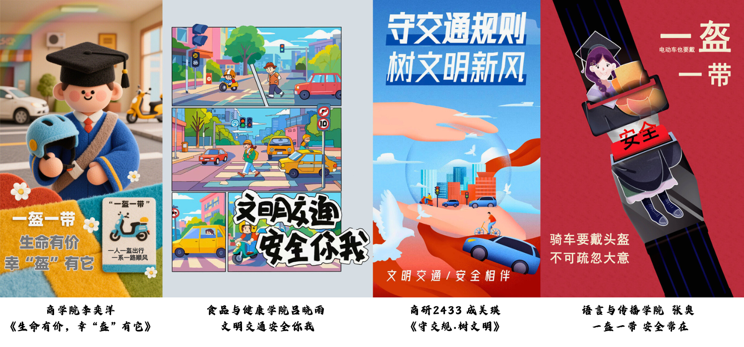 为推动文明交通理念传播,增强研究生交通安全意识,党委研究生工作部立足“文明交通、携手共创”主题,于2025年4月—5月间开展了2025年研究生文明交通主题作品创作征集活动。自通知发布后,得到各学院研究生的积极响应,共收到各学院推荐的百余份公益广告、海报、短视频等原创作品,经过组织评审,学校向海淀高校交安联办推荐142份研究生创作作品,分别是商学院86份、经济学院27份、马克思主义学院10份、计算机与人工智能学院9份、设计与艺术学院5份、食品与健康学院3份、轻工科学与工程学院及设计与艺术学院各1份。我校推荐报送的文明交通主题作品,因主题鲜明、形式新颖、贴近学生实际,获得主办方充分肯定。