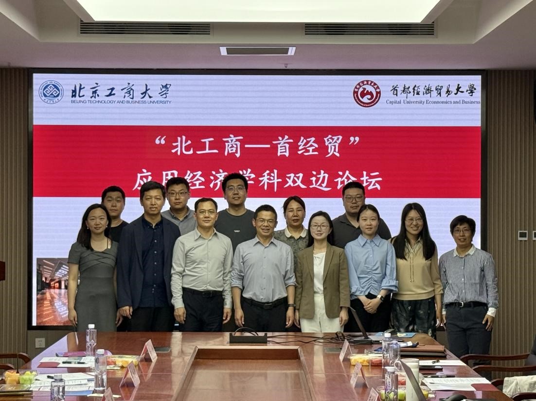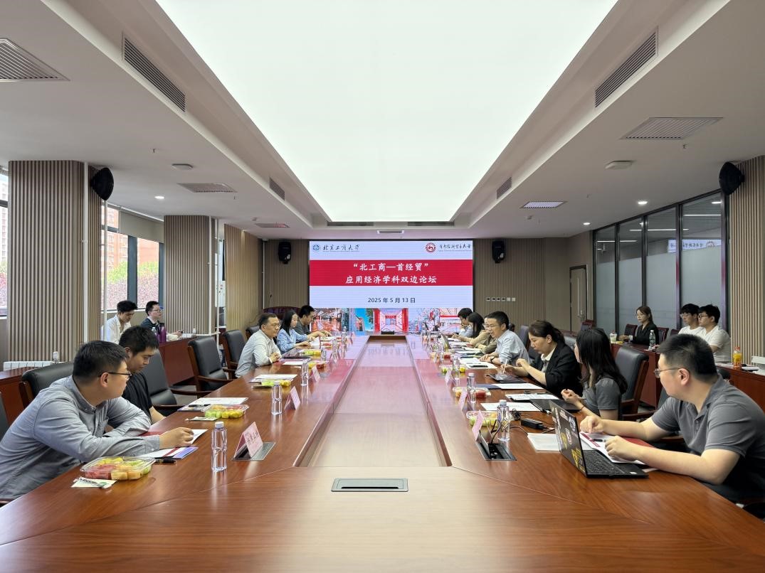5月13日下午,“北工商-首经贸”应用经济学科双边论坛在我校良乡主校区举办。首都经济贸易大学金融学院院长周开国教授,数据科学学院副院长沙叶舟教授,科研处副处长何枫教授,金融学院教师焦安琪副教授、汪念玲副教授、马彪副教授、杨李正博,北京工商大学经济学院执行院长詹新宇教授,副院长牛晓燕副教授,经济系主任陈真玲教授、教师杨晓婷副教授、张凡,金融系李波副教授、李惠璇副教授和我院20余位研究生参加此次论坛交流活动。