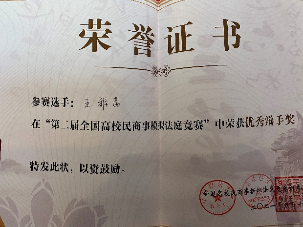 5月8-10日,第二届全国高校民商事模拟法庭竞赛在中国政法大学举行,学校法学院首次组队参赛。队员王雅茜荣获优秀辩手奖。
