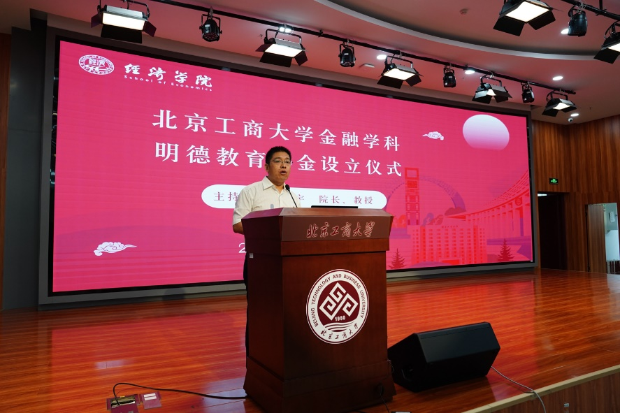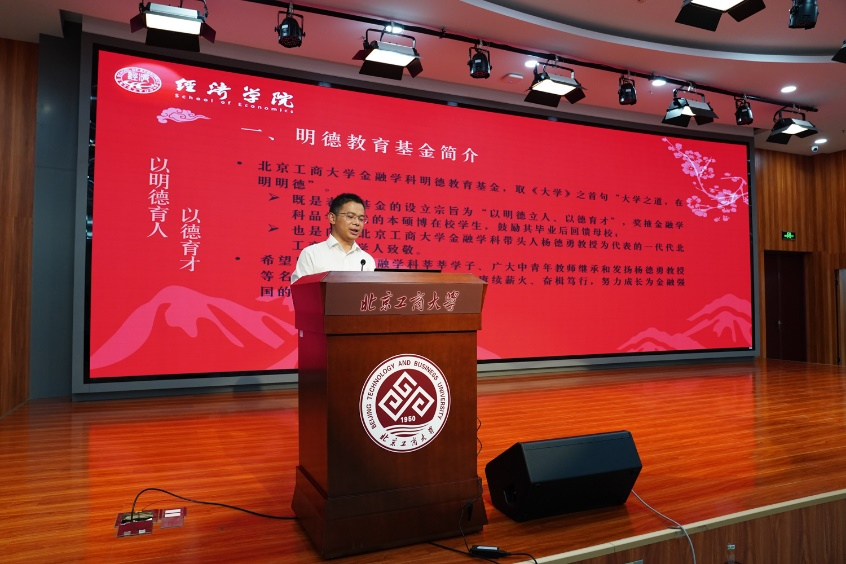 基金成立仪式由詹新宇教授主持。詹新宇介绍了北京工商大学金融学科明德教育基金名称的由来与设立基金的整体设想。“明德”二字取自于《大学》之首句“大学之道,在明明德”,既是表明基金的设立宗旨为“以明德立人、以德育才”,也是向以北京工商大学金融学科带头人杨德勇教授为代表的北工商金融学人致敬。该基金将对金融学科未来的教学、科研和学生培养提供全方位的支持。詹院长回顾了北工商金融学科自1993年创建以来的发展历程和所取得的系列成就,尤其是对金融学科带头人杨德勇教授从教四十年来的辛勤耕耘与丰硕成果表达敬意,并寄语金融学科,希望未来能够赓续薪火,再谱华章。最后,詹院长宣布金融学科明德教育基金正式成立。