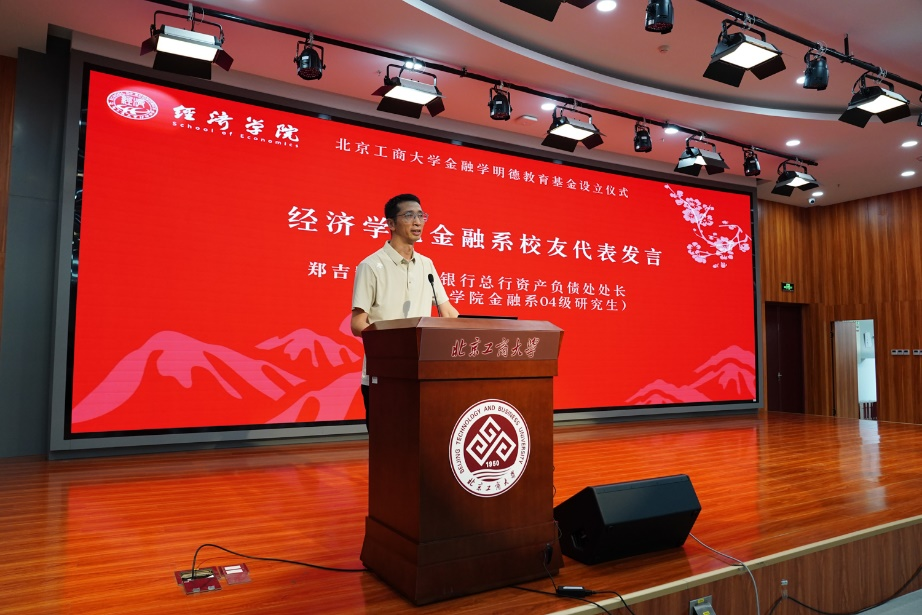 04级金融校友、中国工商银行总行资产负债处郑吉凯处长代表金融专业毕业生向明德教育基金的发起者致敬。他强调了“明德”精神对金融人才的重要性,即要有高尚的品德、社会责任感和“明德向善”的心。明德发展基金的成立也是一种精神感召,他代表校友们承诺,将积极践行“明德”精神,支持母校发展,为社会创造价值。