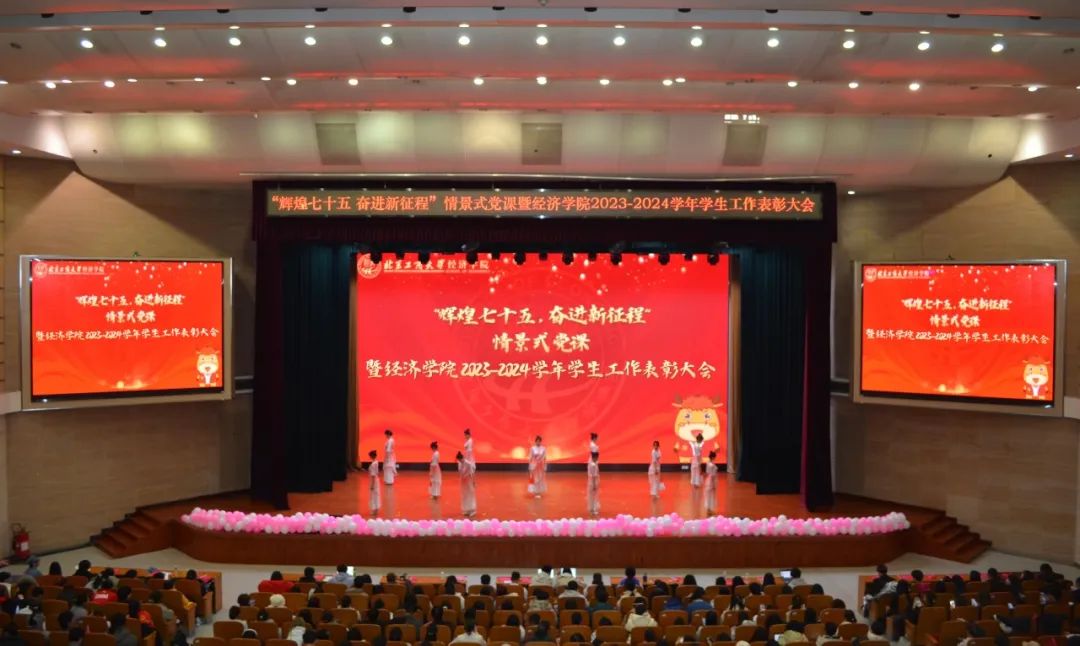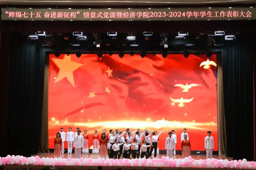 榜样熠熠,光辉相承。适逢建国75周年华诞及一二九运动89周年之际,12月4日,经济学院在良乡主校区举办“辉煌七十五 奋进新征程”情景式党课暨2023-2024学年学生工作表彰大会,旨在回顾那些激荡人心的历史瞬间,大力弘扬爱国主义精神,深切激发青年学子的家国情怀与责任担当,让红色基因与榜样力量薪火相传。