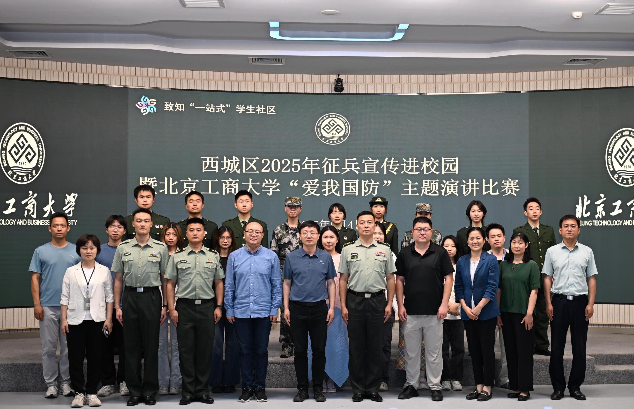 为纪念中国人民抗日战争暨世界反法西斯战争胜利80周年,增强青年学子参军报国热情,6月4日,在西城区人民武装部的大力支持下,学校在良乡校区举办西城区征兵宣讲进校园首场宣讲会暨北京工商大学“爱我国防”主题演讲比赛。西城区人民武装部副部长周冰,北京中医药大学武装部副部长赵小虎,我校武装部部长郑光、副部长党浩,数学与统计学院党委副书记毕平平以及百余名师生参加此次活动。