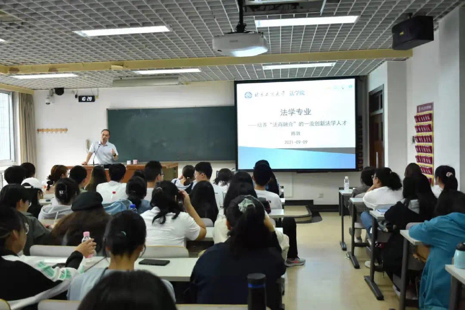 为培养“法商融合”的一流创新法学人才,帮助新生同学了解法学专业特点、明确学习方向,学院组织开展“走进专业”系列讲座。首场讲座特别邀请吕来明教授,围绕如何成为一名自觉自信的法律人,深入浅出地讲解了法律逻辑、法律价值,带领大家走进法学专业。陈敦副院长以《培养“法商融合”的一流创新法学人才》为题详细介绍了法学专业的发展历程、专业荣誉、培养目标及培养路径等专业内容。李晗副教授通过解读司法考试,引领新生了解法学专业现状,切实增强法学专业学生的职业竞争力。教师姚邢对于就业、升学、考研等热点问题,提出了兼具针对性和实用性的建议,她建议同学们合理规划时间,优化学习方法。法学院通过全方位立体化的专业启蒙教育,培养新生尽早建立法律思维,为法治中国建设贡献青春力量。