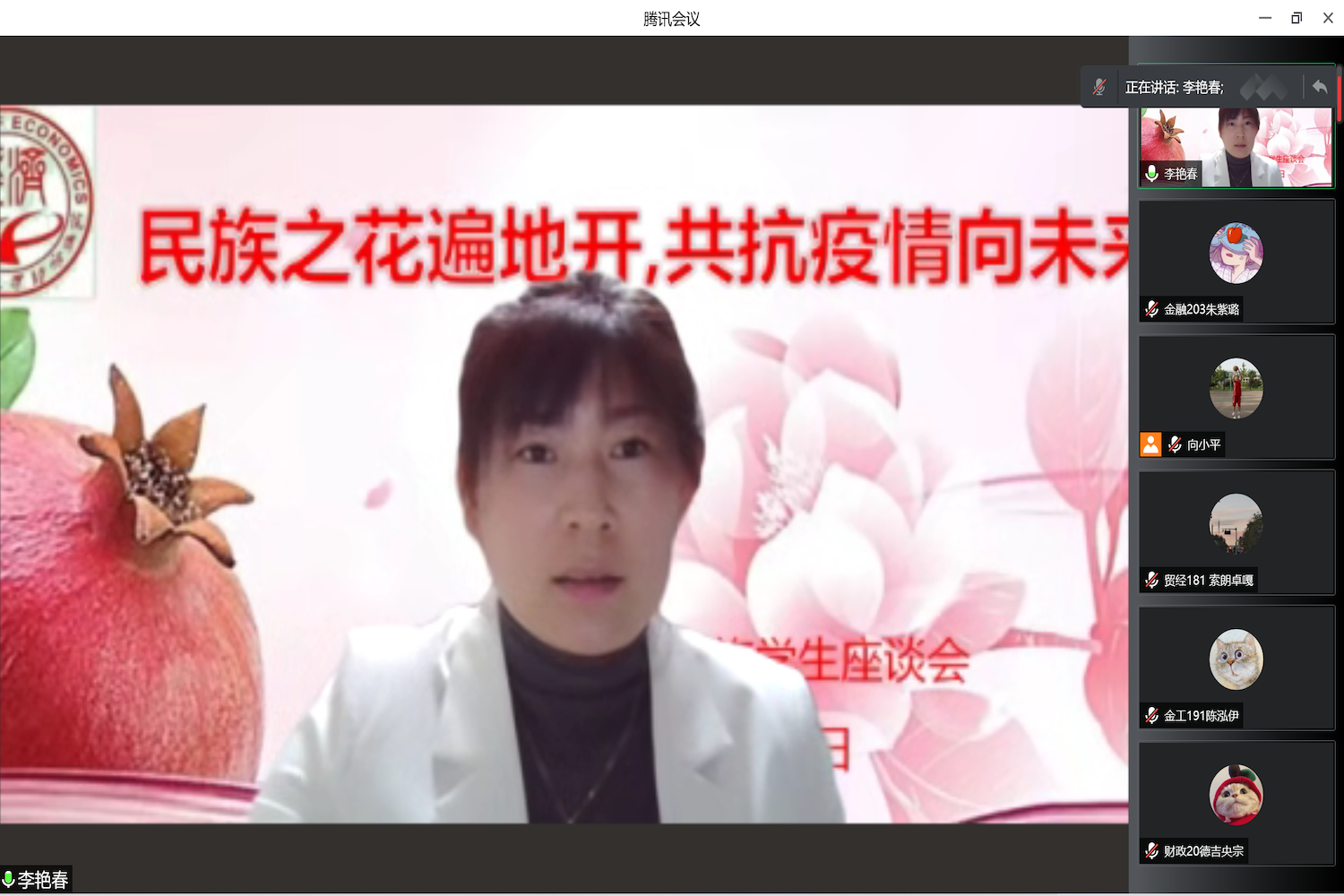 经贸211班 再依努尔.依米提、财政20班李美琪、经贸213班刘璐雪、金融217班罗爔作为少数民族学生代表发言,他们围绕学习、生活、心理等方面分享了自己的经验,同时也就疫情期间居家学习和防控措施等问题进行了交流。学生代表们纷纷表示在疫情居家学习期间,学院给予了许多关爱和支持,同时也对疫情期间的学校管理表示充分的理解和认可。他们表示,在居家学习时,一定要保持规律的作息时间,提高学习效率。作为新时代青年,在疫情防控的关键时刻,要有青春担当,主动遵守当地的疫情防控要求,用实际行动回报师长、回报学校、回报社会,希望不久的将来能在春暖花开的校园再次相遇。