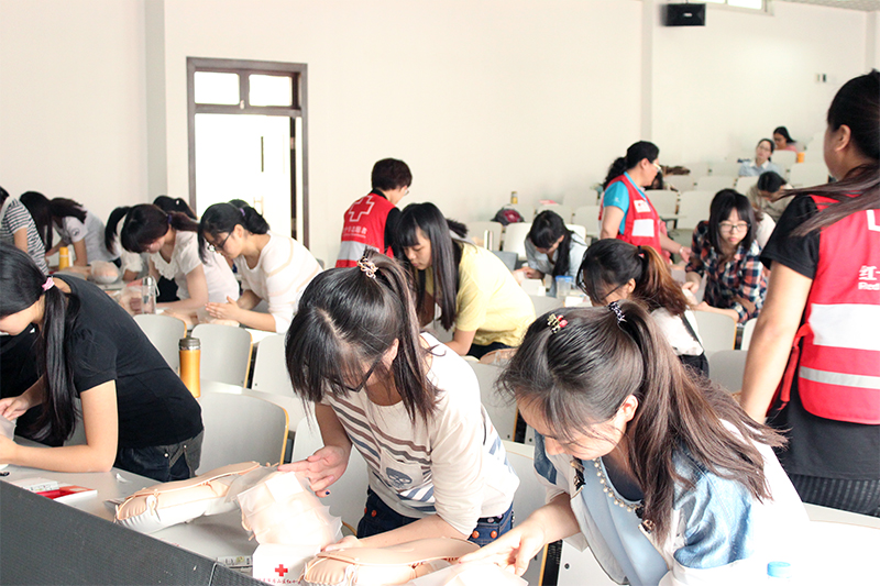 与以往不同,本次急救培训采用小班式教学,学员的人数限制在40人以内,并且首次尝试16学时,即两天的急救培训。学习内容包括简单包扎、心肺复苏、AED的使用等,内容更加丰富,形式更为多样。小班式教学使得同学们有更多的机会与讲师交流,学员们人手一个教具,大大增加了学习效率,有利于同学们更快更好地掌握急救技能。