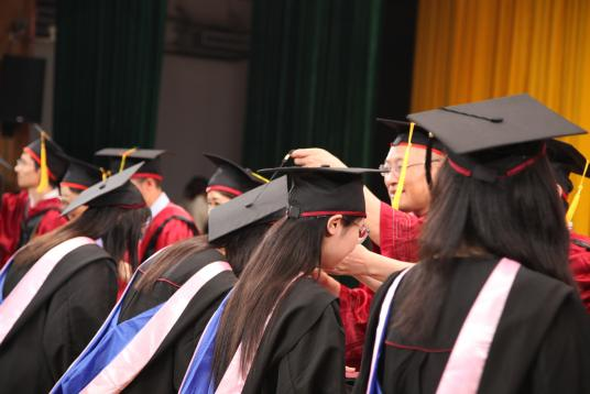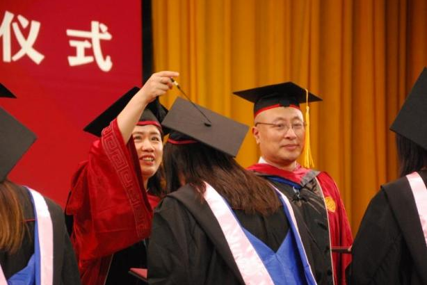 在2023届本科毕业生学位授予仪式环节,学院学位委员会成员张春萍、毛新述、张倩、孙永波、张伟华、邓春平、彭红星、张晨宇、王勇及导师代表朱蓉共同为全体本科毕业生拨苏正冠并颁发学位证、毕业证。正冠拨穗,商舟扬帆,领航未来。