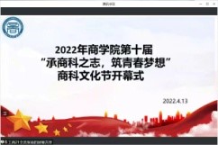 为加强学风建设,促进学生专业实践能力提升,培养优秀商科人才,引导学生在居家学习之余参加学术竞赛活动,商学院第十届商科文化节开幕式于4月13日线上举行。本届商科文化节的主题是“承商科之志,筑青春梦想”,参加开幕式的有学院党委副书记张倩、团委书记及各年级辅导员,邀请了五位优秀学生代表进行经验分享,活动吸引了近300名本科生参加。