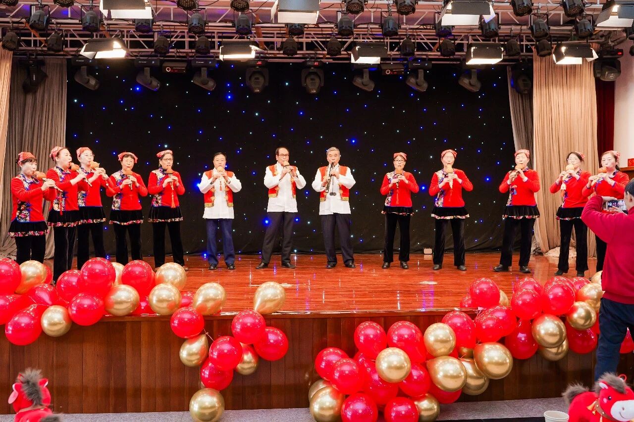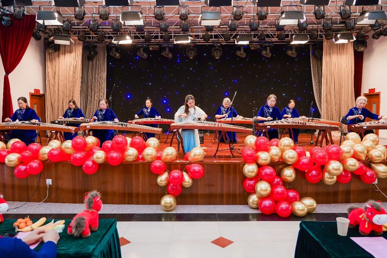 10支表演队伍轮番登场,各展风采。金乐舞蹈队的《欢天喜地迎新春》以灵动欢乐的舞姿营造出浓浓的节日氛围;由教职工合唱团表演的小合唱《往日时光》,则以优美而空灵的歌声向老同志们致以崇高敬意。古筝队《珊瑚颂》的清雅琴音,展现了传统音乐的魅力。柔力球队创编的《赶着马车去北京》《苍穹唤》融合传统与现代元素,该队还曾荣获北京市高校老同志“最佳风采奖”;葫芦丝队带来的《映山红》,以悠扬婉转的乐声勾勒出深情的革命记忆;爱心健身操队自编自演的舞蹈《锦绣》,用舒展流畅的舞姿展现出新时代老年人的活力与自信;时装队精心编排的时装走秀,老同志们身着各式华服,步履从容、仪态优雅,在T台上绽放出独特魅力,赢得了阵阵掌声。