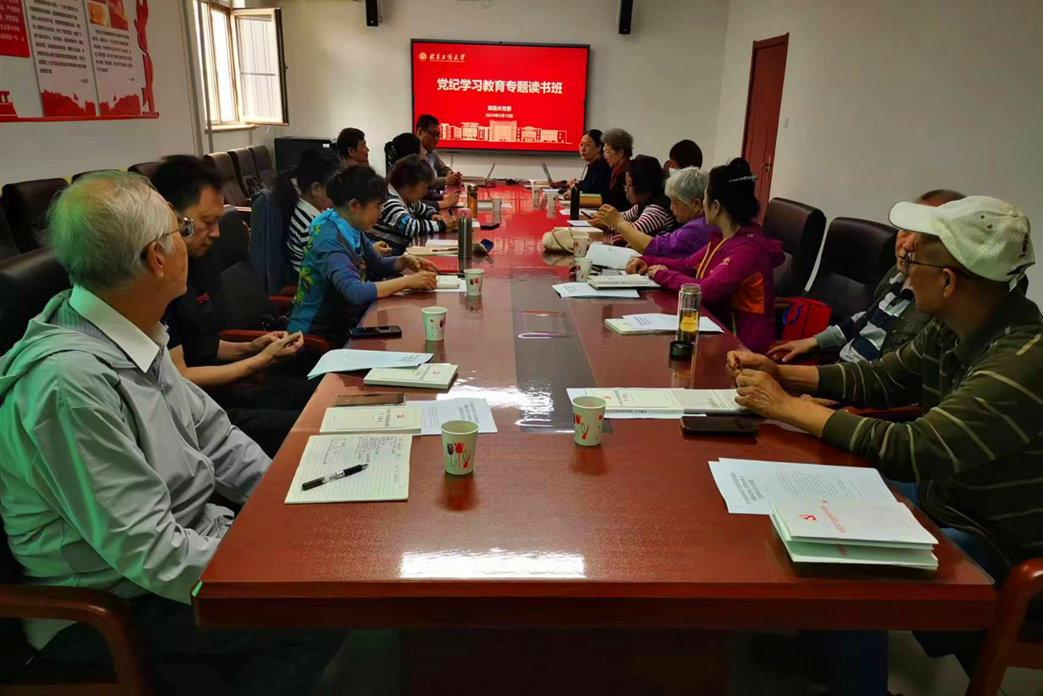 为了深入开展党纪学习教育,进一步深化党员干部对《中国共产党纪律处分条例》(以下简称《条例》)的理解运用。5月10日,离退休党委举办党纪学习教育专题读书班,开班式由离退休党委书记王红英主持,离退休工作处处长樊江涛、离退休工作处副处长夏本翠、离退休党委理论学习中心组成员、各离退休党支部书记参加学习。本次读书班采取个人自学、专题辅导、代表发言、交流研讨相结合的形式,坚持原原本本、逐章逐条学习《条例》,把自己摆进去、把职责摆进去、把工作摆进去,深学细悟、明规知戒,力争取得扎扎实实的学习成效。