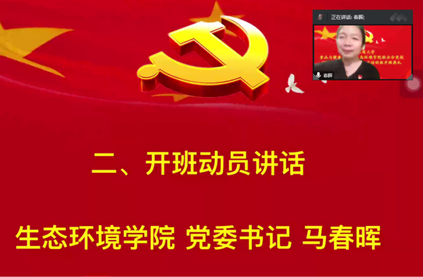 为进一步加强对入党积极分子的培养、教育和考察,提高入党积极分子的政治素养和理论水平,保证党员发展质量,12月2日,食品与健康学院、生态环境学院联合分党校以线上的形式举行了2022年秋季入党积极分子培训班开班典礼。食品与健康学院党委书记胡燕霞、生态环境学院党委书记马春晖出席了开班典礼,专职组织员李璐、李娜,党校兼职辅导员以及133名入党积极分子参加了开班典礼。