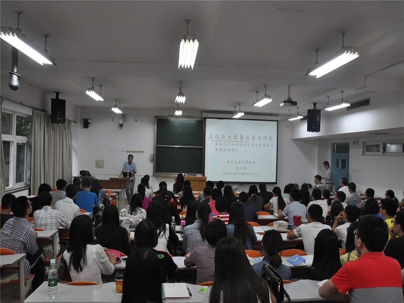 杨士强教授以《漫谈论文质量与学术评价——兼谈为什么对研究生毕业发表论文要制定标准》为题,结合新生入学教育阶段特点,强调了从本科学习知识到研究生创造知识的转变,并详细阐述了研究生论文的重要性、论文的评价标准以及如何作一篇好论文。杨教授结合在学位分委员会主席岗位上遇到的实际问题,详细列出了中国计算机学会(CCF)制定的针对不同学科方向的学术期刊和会议列表,并有针对性地解答了如何看待与评价学术论文的质量、如何提高研究生的学术追求等问题。在讲座最后,杨士强教授还鼓励同学们全力投入到学术研究中去,大胆追求自己的学术理想,做一名高水平高质量的研究生。