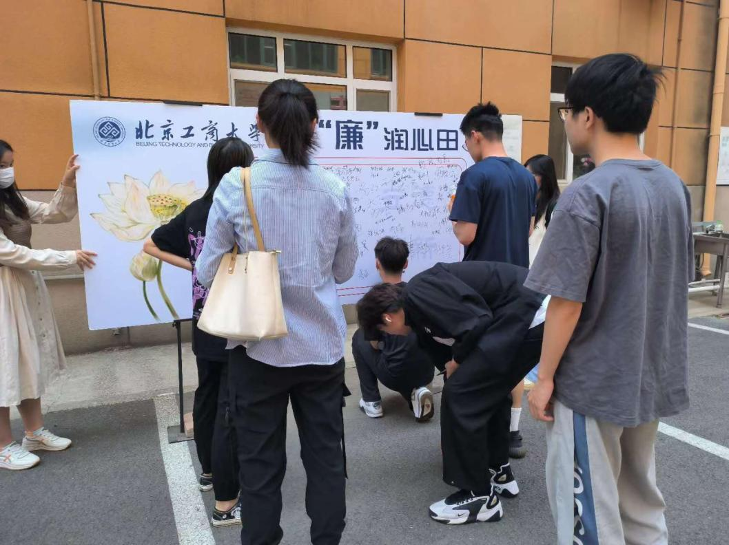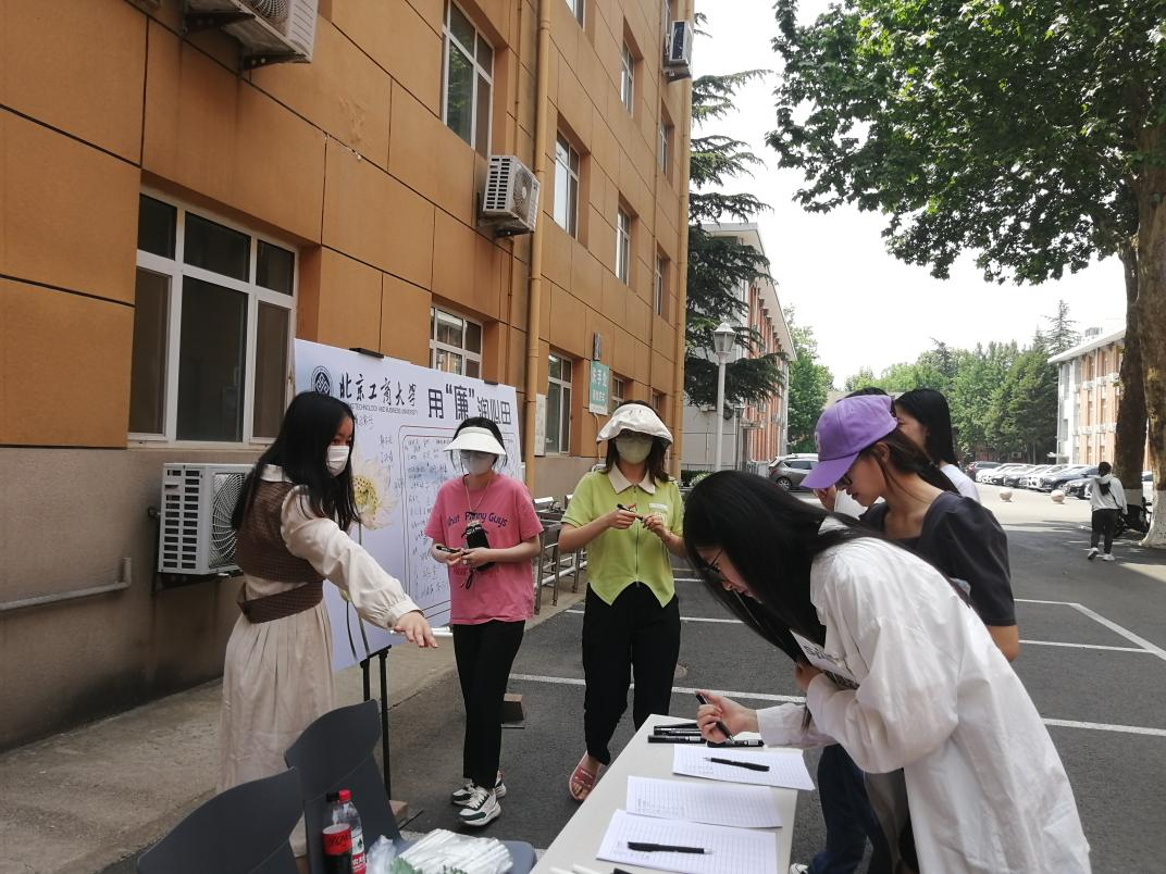 为营造良好的校园廉洁文化,商学院研究生会于5月14日11:00-13:00在阜成路西校区食堂门口举办“清风扶正气 廉洁伴我行”廉洁承诺签名活动。此次活动是商学院开展学生廉洁主题教育系列活动之一,共吸引了来自商学院、国际经管学院、轻工科学技术学院、生态环境学院等7个学院、180余名同学积极参与。