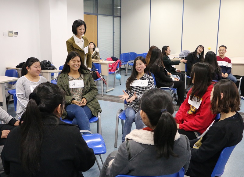 本次讲座张老师以团体心理辅导及游戏的方式领会本次讲座的主题,旨在朋辈间相互熟悉与了解。在简单的热身游戏后,张老师就开始引导大家进入主题。本次辅导内容主要分为两个环节,第一个环节是“熟悉彼此”,第二个环节是“体会信任”。环节一包含了四个游戏:游戏一,同学们起身走动,每名同学至少与五个自己不认识同学进行握手问好。游戏二中,同学们四人一组,组员相互介绍自己,然后两两小组合并,每个组员说出自己的名字并摆出一个动作,其他组员须要重复名字和动作。游戏三,每人手里一个桔子,每名同学找到自己手里桔子的特点。张老师启发说:“一个人的成长就像桔子的生长过程,每个人都有自己与众不同的地方,人的成长经历会更复杂,其中包括了父母基因,接触的人与事,生活的时代背景等因素。人要去发现自己独特的一面,不管是优点还是缺点都是自己的,要爱护自己,这样爱护其他同学时才会更有力量。”游戏四,每组拥有一个小球,扔球的同学喊出接球同学的名字并将球迅速扔给对方。在环节一的游戏中,起初同学们都很腼腆,但在张老师的鼓励下,气氛逐渐活跃,大家不再拘束,已经开始彼熟悉,教室里充满了欢声笑语。