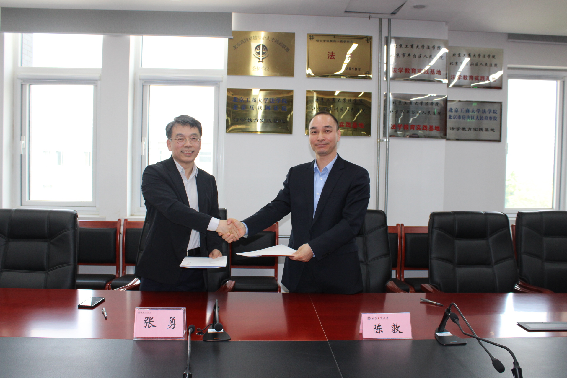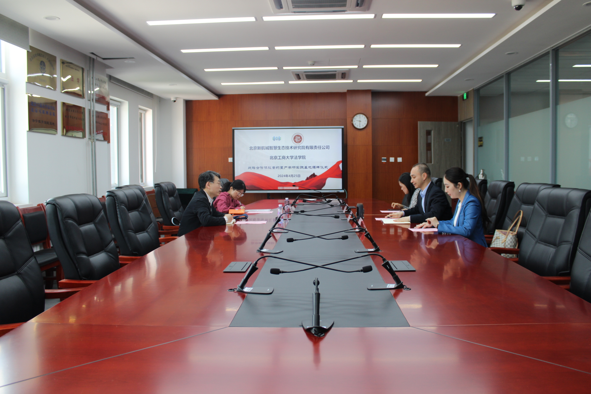 4月25日,法学院与北京新航城智慧生态技术研究院有限责任公司(以下简称“新航城研究院”)战略合作协议签约暨产学研实践基地揭牌仪式在法学楼顺利举行。新航城研究院董事长张勇、研究中心主任韦芳玲,法学院院长陈敦、副院长刘冰、国际法学系教师韩璐参加仪式。