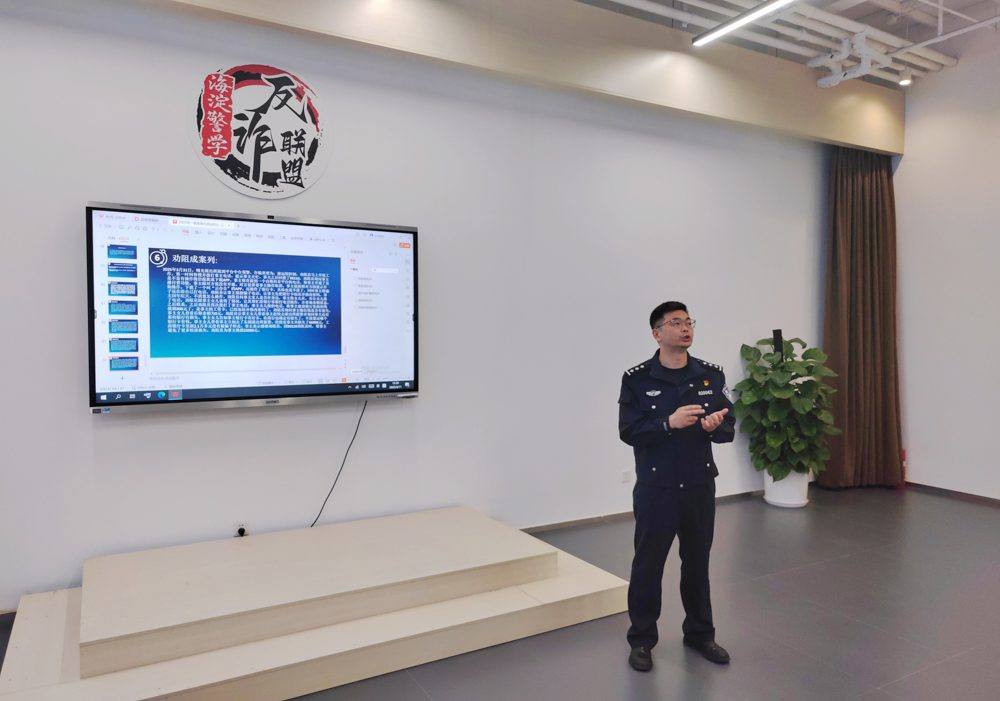 海淀公安分局高校内保支队民警陆泽山、曙光派出所反诈预警劝阻专员李鹏以“诈骗类型与话术识别”为主题,为同学们讲述反诈知识“第一课”。通过民警讲述,同学们了更加直观地了解了“刷单返利”“虚假投资”等常见诈骗类型,并通过下载安装国家反诈中心APP主动学习反诈技巧。之后,研究生们在民警带领下参观了调解劝阻室、警民照片墙等场所,其中“诈骗话术创意海报”以诙谐幽默的方式形象揭示诈骗套路,引发大家驻足观看并深度讨论。