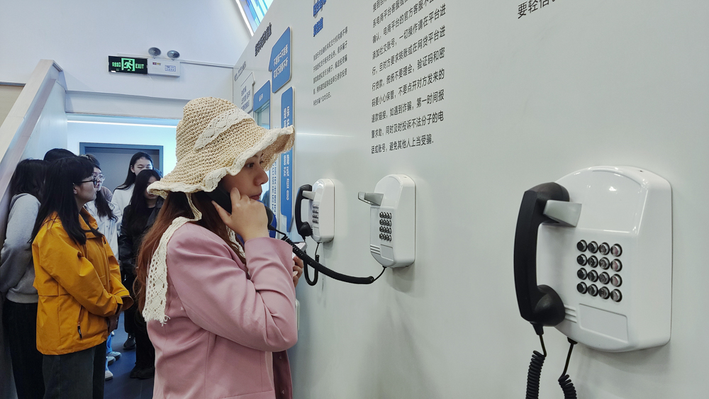 讲解员介绍了现场装置的诈骗语音集锦墙,同学们拿起电话,“客服退款”“中奖通知”等诈骗话术便在耳边响起,真实模拟诈骗电话的接听场景,创意的设计和沉浸式场景还原让大家有身临其境的感觉。