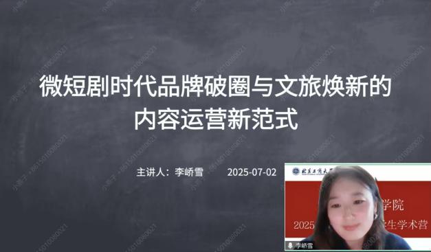 李峤雪副教授带来《微短剧时代品牌破圈与文旅焕新的内容运营新范式》,她结合当前微短剧市场的火爆态势,精准分析了其内容与传播的核心特征,并以此为基础,重点探讨了微短剧赋能文旅品牌破圈升级的创新模式及其对其他行业的启示价值,揭示了新媒介形态下的内容运营新逻辑。