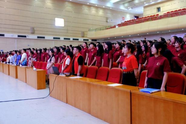 升国旗,全场师生庄严奏唱国歌。