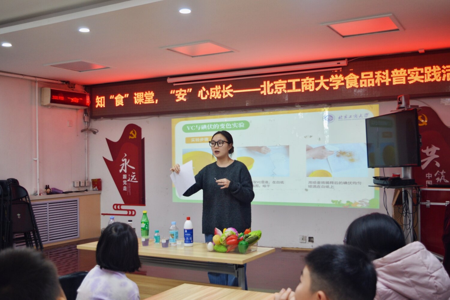 春节前夕,实践团先后赴海淀区北下关街道大柳树社区、甘家口街道四道口社区、丰台区和义街道和义东里第三社区开展“知‘食’课堂,‘安’心成长”专题科普活动,共计约60组社区家庭参与其中。活动以互动问答“我们为什么要吃饭?”巧妙切入并讲解《中国居民平衡膳食宝塔(2022)》,通过生动的彩色图示与朗朗上口的口诀,帮助儿童快速掌握食物分类与营养知识。“紫甘蓝变色实验”与“维生素C与碘伏变色实验”使孩子们在动手实践中直观理解了花青素的特性与维生素C的还原性,现场欢声笑语、反响热烈。本次活动采用“亲子共参与”的形式,为家庭提供了共同学习健康知识的场景,许多孩子表示愿意成为家庭“健康监督员”,推动家庭实践“清淡饮食、均衡营养”。活动不仅有效传递了知识,更激发了儿童对食品科学的浓厚兴趣,触达了“教育一个孩子,影响一个家庭”的深远目标。