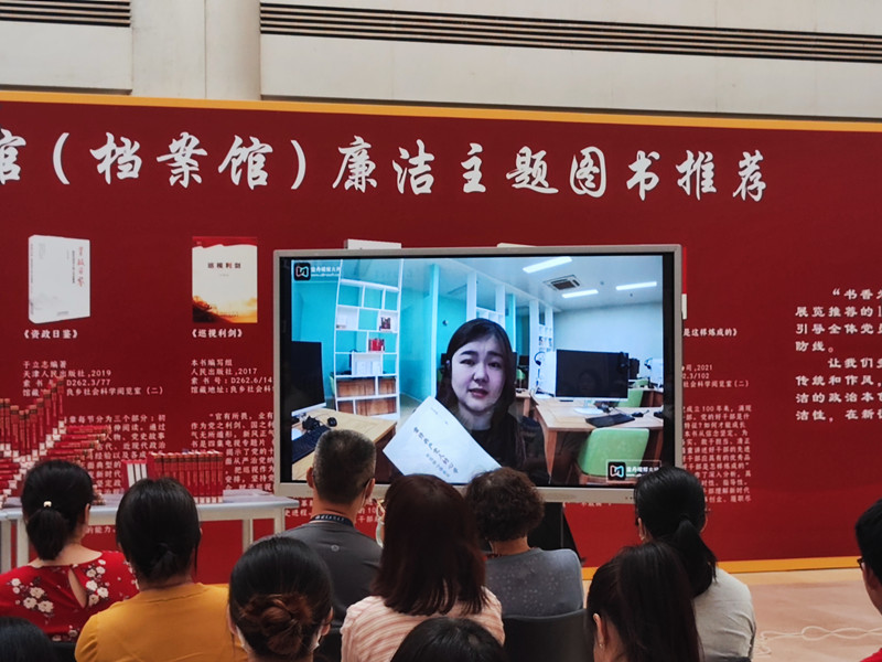 5月31日,图书馆直属党支部组织党员及部分学生读者共同召开廉洁文化主题图书阅读分享会,播放了精心制作的廉洁图书阅读分享专题视频。张楠在讲到自己阅读《勤俭廉洁的毛泽东家风》时感慨地说:“中华民族五千年历史,培养良好的家风早已经成为传统。毛泽东家风,是毛泽东留给中国人民最宝贵的精神财富之一。” 张文杰给大家推荐的图书是《常修共产党人的心学:不忘初心再出发》。她在分享感悟时谈道:“通过阅读,品读历史人物的人生际遇,对照当下的政德修养,就能体悟到修身立德、廉洁从政才是共产党人应该拥抱的充实人生。”