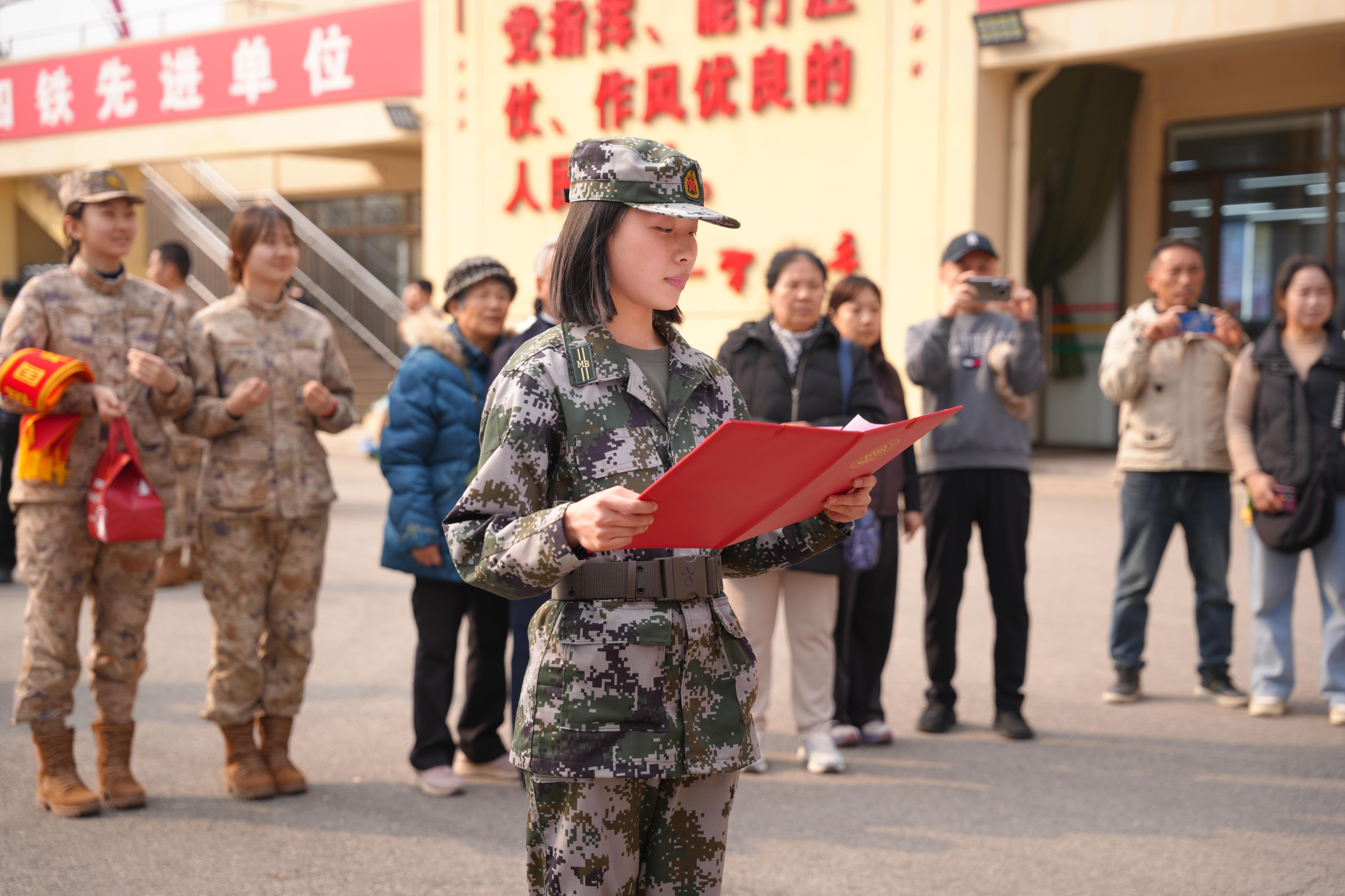 退伍大学生代表史梦琪宣读2026年春季入伍学生名单。新兵们依次应答,声音铿锵有力,眼神坚定果敢。