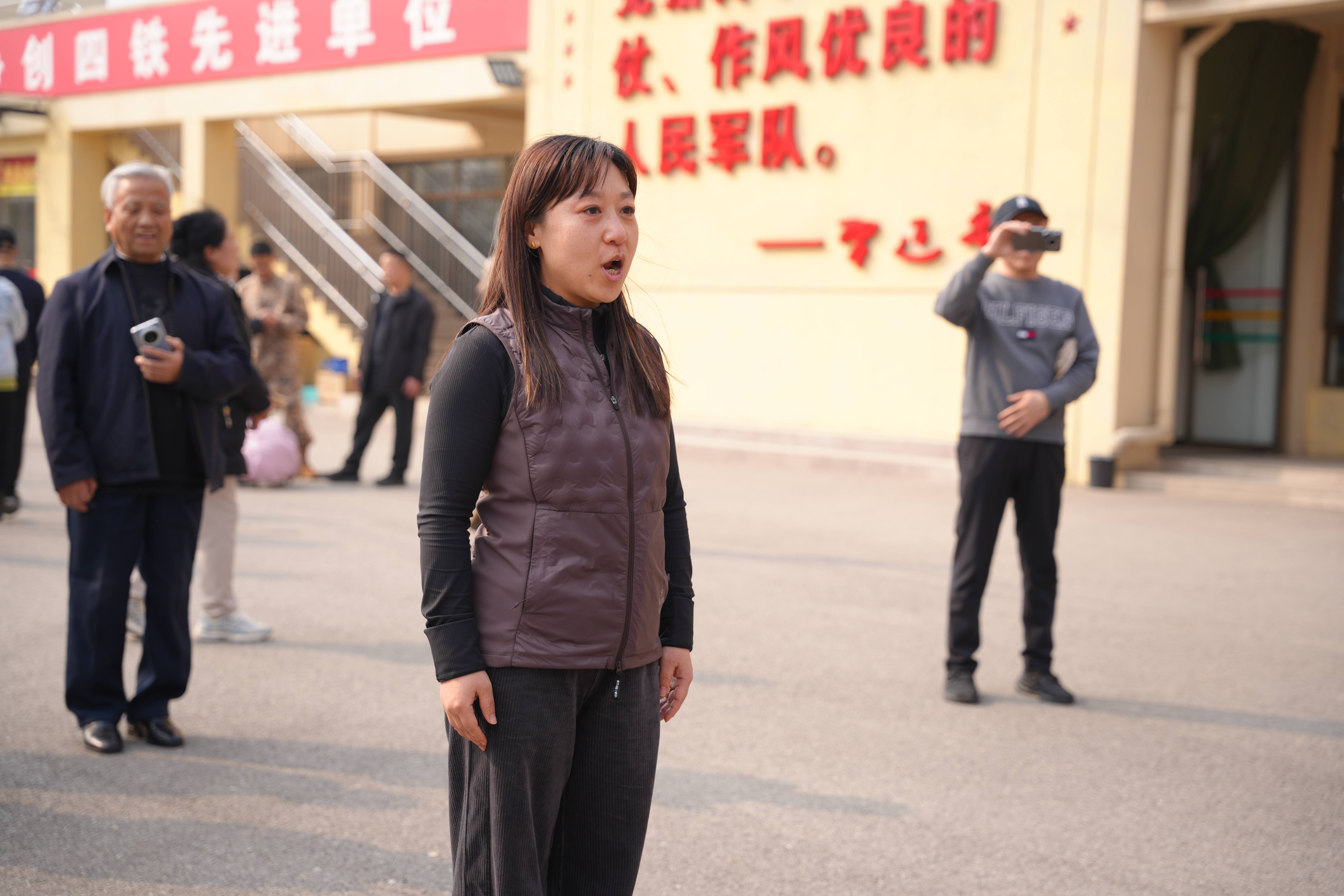 新兵家长李梓铭妈妈登台发言。她向学校的悉心培养表示感谢,寄语孩子们在军营中刻苦训练、勇担使命。