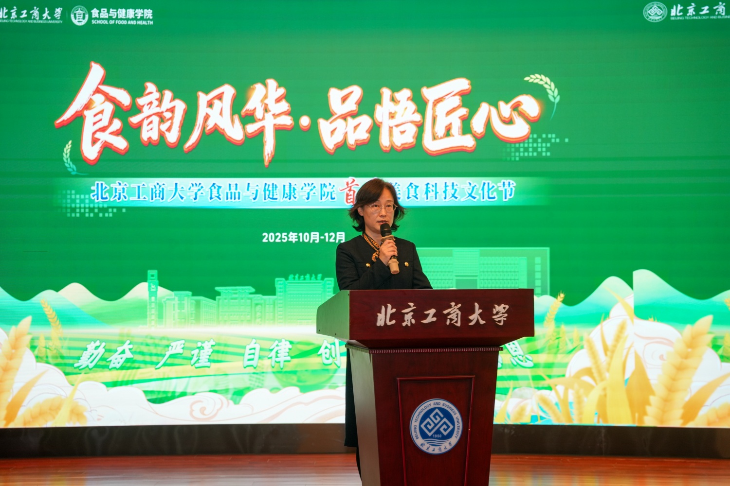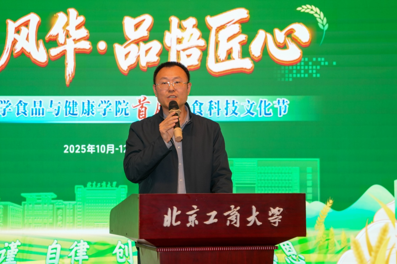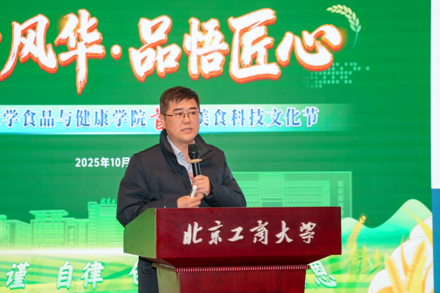 食品与健康学院院长王彦波致辞,向莅临活动现场的各界嘉宾表示热烈欢迎和衷心感谢。他谈到,学院始终坚持服务国家战略、服务新时代首都发展的使命,以“工商一体化”理念为引领,推动学科交叉融合,在“AI+食品健康”“智能检测技术”“功能性食品研发”等前沿方向持续突破。他鼓励同学们以美食科技文化节为“科创练兵场”,主动走进美食嘉年华和企业嘉年华,在互动中深化专业认知;主动参与学术交流,在研讨中拓宽思维视野;主动参加各类学科竞赛,在竞技中锤炼实践能力。