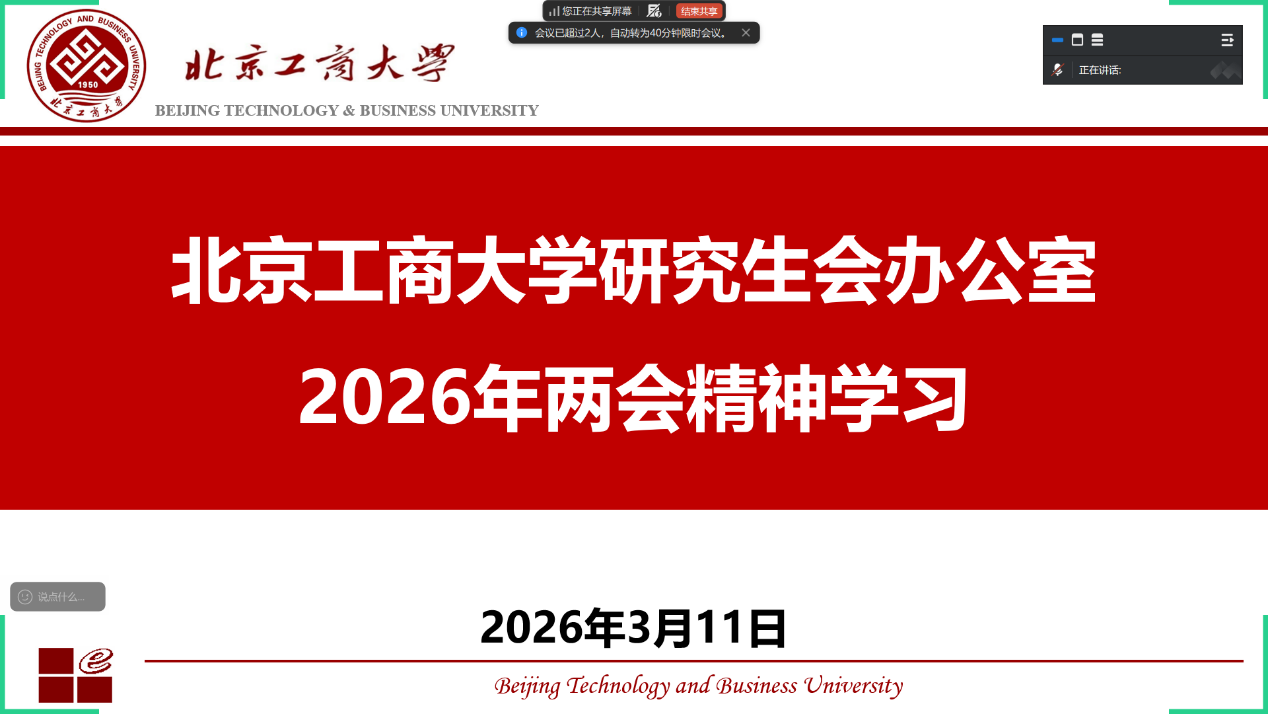 健全长效机制,推动党建育人纵深发展。本次专题学习活动是对研究生党建育人体系的一次成功检验与生动实践。通过研工部统筹、学院发力、基层组织落实、骨干带头,构建起上下联动、协同发力的育人格局,实现了两会精神在研究生群体中精准传达、入脑入心、落地践行。广大研究生在学思践悟中进一步增强了服务国家战略的自觉性与主动性,展现了新时代研究生奋发有为的精神风貌。下一步,党委研究生工作部将持续深化“四维一体”学习体系,紧扣“十五五”规划部署,推动理论学习与学科建设、科研创新、人才培养深度融合,引导广大研究生将个人成长融入国家发展大局,为推进中国式现代化建设贡献青春力量。
