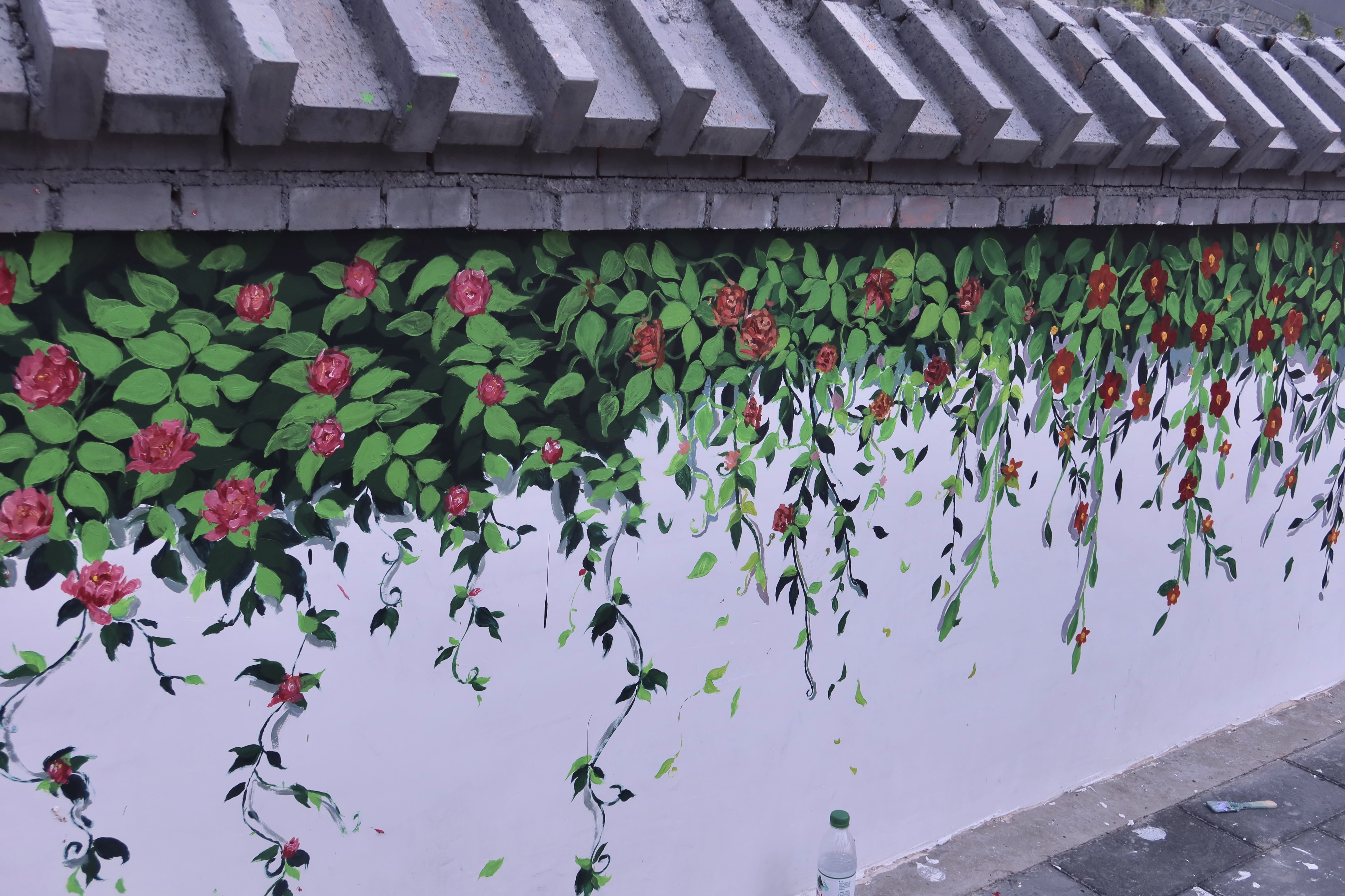 实践团在田庄村开展墙体彩绘,助力乡村环境美化,用专业所学扮靓乡村。烈日炎炎下,同学们专注勾画,精美画作跃然墙上,停笔眺望,青山绿水映入眼帘。通过同学们的巧手绘画,绿色的藤蔓、彩色的鲜花便爬满了半面墙,与周围的青山绿水遥相呼应。虽然同学们画风各异,一种植物十五个样,但这正体现了植物的野蛮生长,组合起来颇有自然趣味。同学们脸上是汗水,身上是颜料,眼里却是用实际行动助力乡村振兴的坚定,一旁白墙上“为人民服务”的红色大字在太阳的照耀下闪烁着金色的光芒,与同学们挥汗如雨的身影相互映衬。实践团成员用实际行动践行“全心全意为人民服务”的根本宗旨,赢得了当地村民的赞赏。在今后的日子里,实践团成员也将继续发扬艰苦奋斗的优良作风,勇立时代潮头,争做时代先锋,把人生理想融入为实现中华民族伟大复兴的奋斗中,不断贡献青春力量。