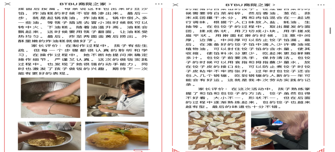 为了激发学生热爱劳动的内生动力,引导学生学会劳动、乐于劳动,掌握必备的劳动技能,形成尊重劳动,劳动光荣的新风向,学院在1月13日至2月15日开展“喜庆二十大,劳动不断线”寒假劳动教育实践活动,主题为“在劳动中成长淬炼”。同学们自己动手做的家乡菜让人垂涎欲滴;大扫除后的房间一尘不染;垃圾分类井井有条;家庭防疫一丝不苟;传统文化相关的作品也精美绝伦,受到了同学们的一致好评。截止活动报名结束,共有近40余人参与本次活动,劳动内容丰富多彩,如“学做一道就家乡菜”中同学们各显奇招,制作各自家乡的传统美食炸油糕、包饺子、糖醋里脊、皮蛋豆腐等等美食佳肴。同学们上传了自己认真劳动的照片,同时也感悟到劳动使人幸福。当一个人专注于自己的劳动时,思维是敏锐的,心灵是充实的,精神是愉悦的,可以说,作为一名劳动者,就是一个幸福的人!