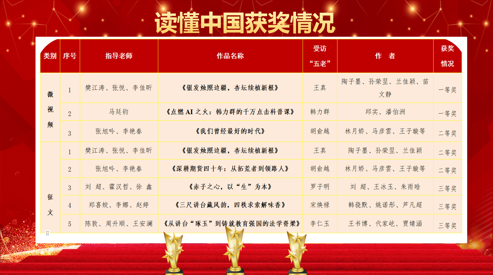 法学院报送的《从讲台“琢玉”到铸就教育强国的法学脊梁》、语言与传播学院报送的《赤子之心,以“生”为本》、食品与健康学院报送的《三尺讲台藏风韵,四秩求索解味香》等荣获三等奖。三篇作品分别刻画了李仁玉教授的法学育人之路、罗子明教授的教育创新实践、宋焕禄教授的科研攻坚故事,从法治建设、教育创新、科技报国等多元维度,诠释了“五老”精神的时代内涵。