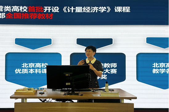 对外经济贸易大学陈志鸿教授分享了《多模块、双通道的<计量经济学>高校课题设计》示范课程。她通过展示课程的多模块双通道设计,包括计量经济理论、计算机操作和实证应用,强调了教学中理论与实践结合的重要性。