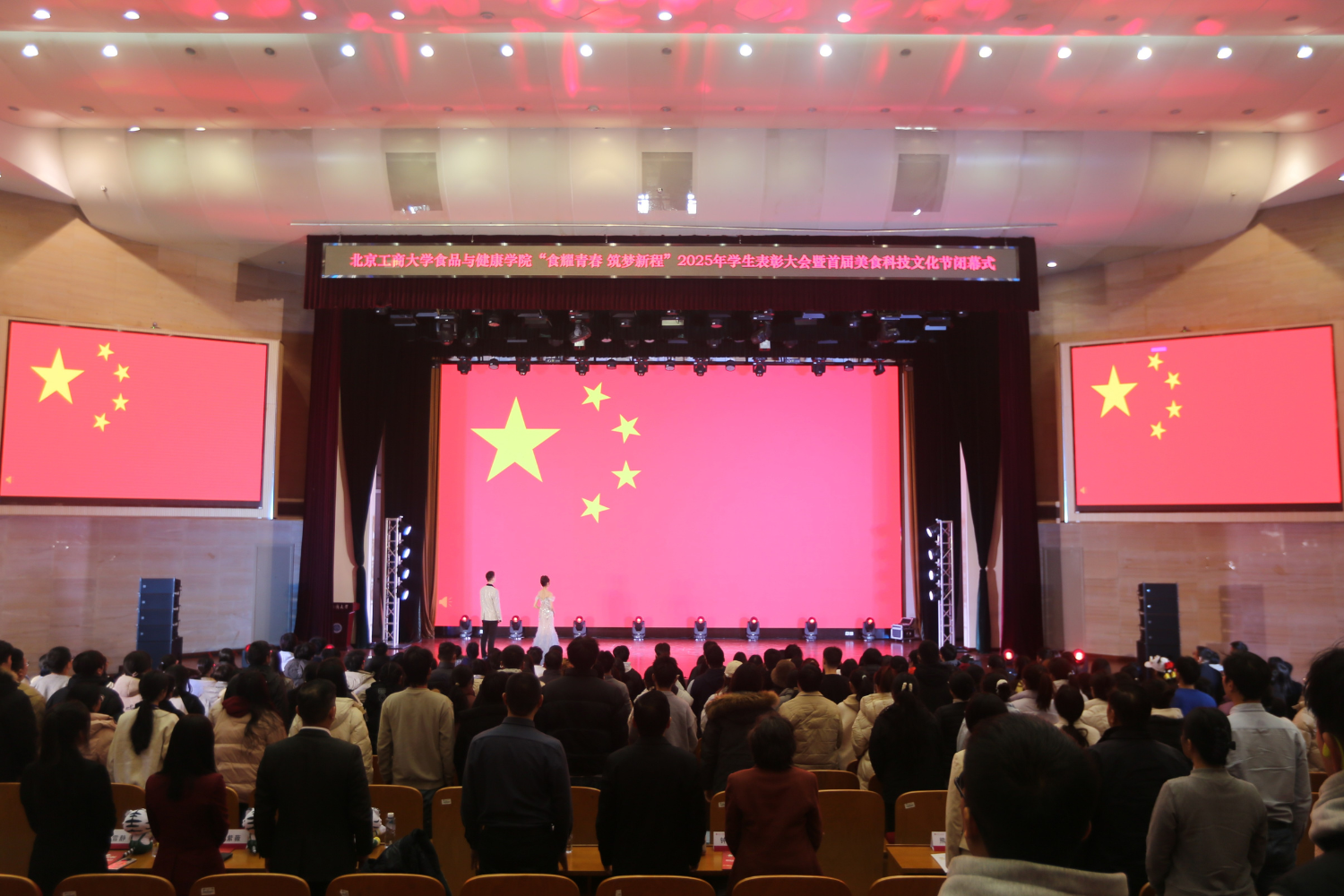 在庄严的国歌声中,大会正式开始。精心编辑的视频回顾了学院“食韵风华·品悟匠心”首届美食科技文化节的精彩片段,展示了学生们的创新实践与突出成果。在一个多月的时间内,从开幕式到三大嘉年华、三大竞赛、三大关键环节,每个项目都圆满结束,每位努力拼搏过的同学都收获了成长和进步。