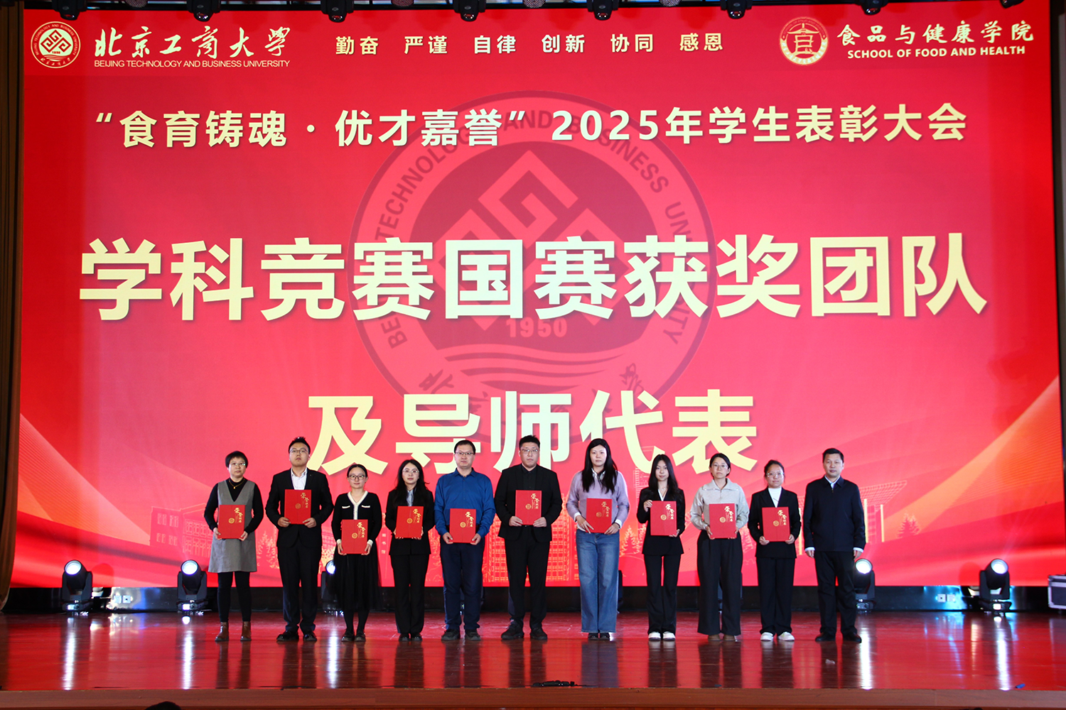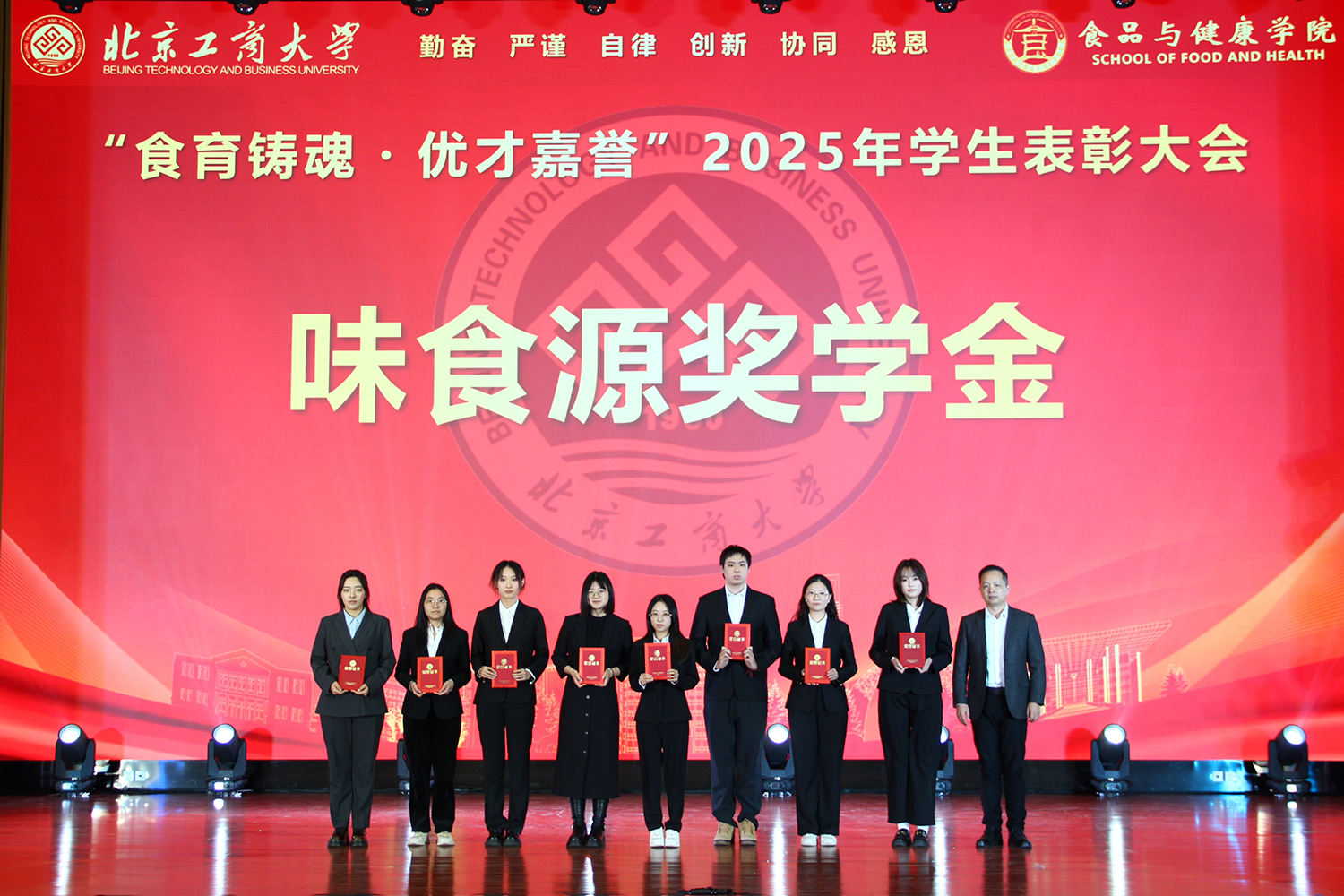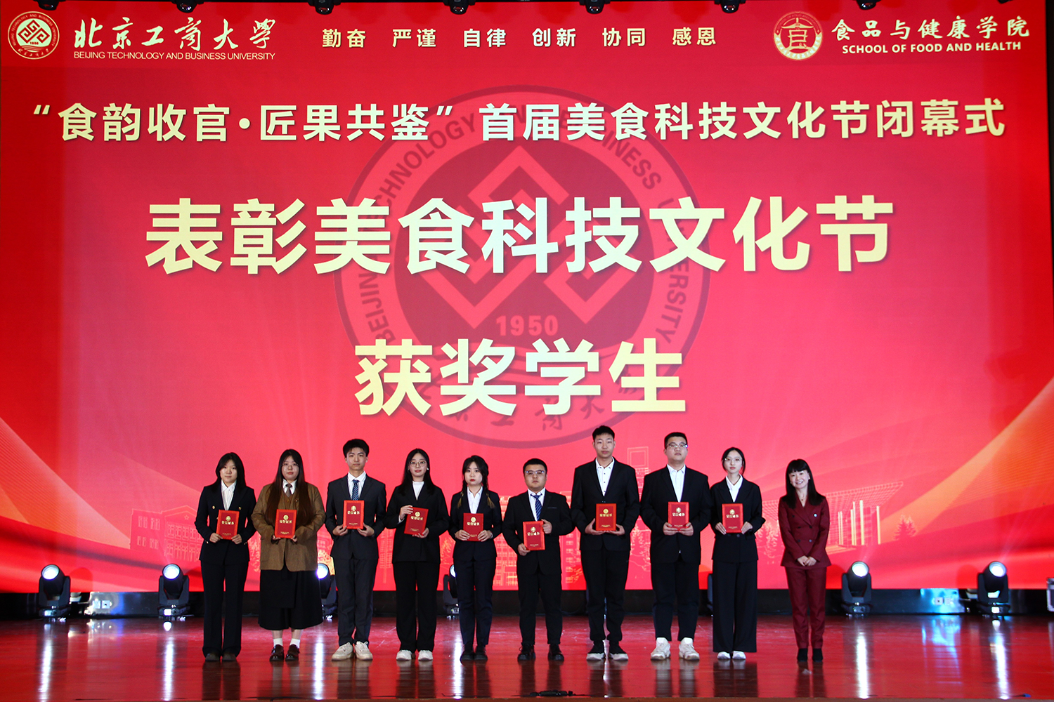 12月6日,食品与健康学院在良乡校区隆重举行“食耀青春 筑梦新程”2025年学生表彰大会暨首届美食科技文化节闭幕式。学校党委常委、副校长寇红江,学校团委书记单紫薇,学院特邀嘉宾味食源奖学金管理方代表、北京味食源食品科技有限公司董事长助理兼研发总监严江,钟香驹奖学基金管理人、钟香驹教授之女钟捷,中融百鸣投资管理集团有限公司董事长陶庆,北京康安利丰农业有限公司党支部书记、副总经理乔雪静,北京藻辰生物科技有限公司创始人杨阳,北京首朗生物科技有限公司常务副总经理李重阳,北京康比特体育科技股份有限公司产品开发中心总监王冬,食品与健康学院领导班子、各系主任以及教师代表、班主任代表、辅导员、学生代表齐聚一堂,共同见证学院人才培养成果,表彰先进典型。