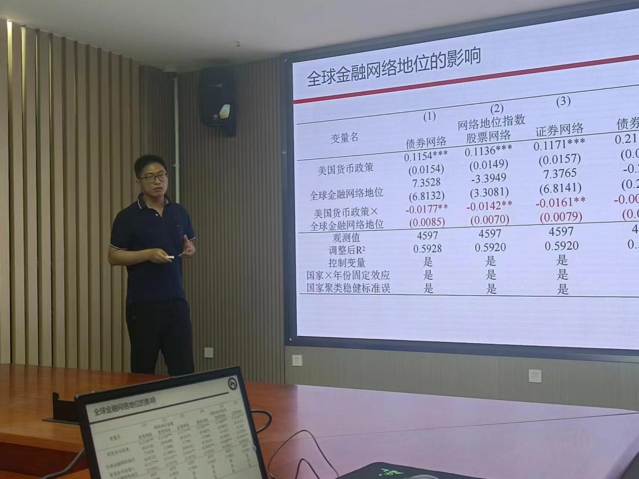 李兴申报告了论文《美国货币政策与全球经济周期同步性:基于全球金融网络地位视角的分析》,深入探讨了美国货币政策与全球经济周期同步性的关系,并且采用了多种稳健性检验方法,增强了研究的科学性和严谨性,也为政策制定者提供了更准确的参考依据。王爱萍分别从论文的选题、研究贡献和研究内容等方面进行了点评和建议。