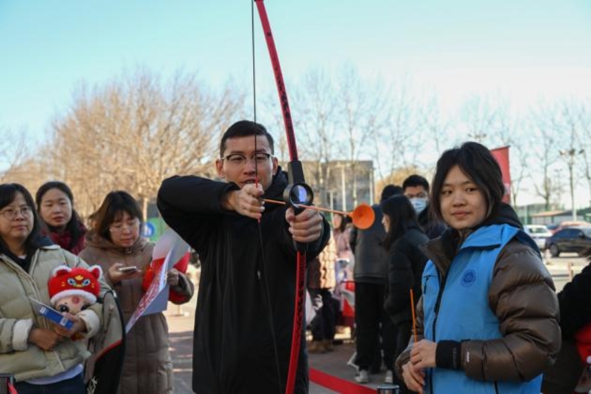 游园会现场阳光明媚,热闹非凡,充满欢声笑语。活动内容丰富多样,共设置了包括幸运投壶、国风蹴鞠、礼射之趣、趣味捶丸、灯影谜趣、投币祈福、非遗漆扇和墨香迎春在内的八项传统文化活动。教职工们积极参与其中,感受着传统文化的独特魅力。