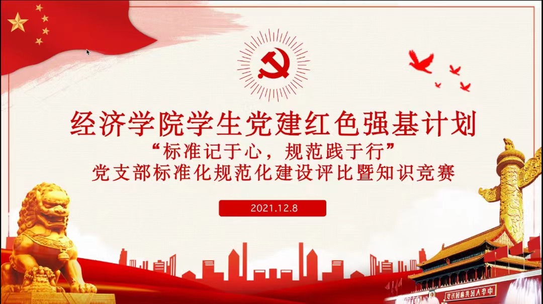 为深入学习贯彻党的十九届六中全会精神,加强学生党支部标准化规范化建设,经济学院于12月8日线上开展了经济学院学生党支部规范化评比暨知识竞赛,学校组织部副部长郑光、经济学院党委书记吕素香、党委副书记李艳春、专职组织员卫一润,以及经济学院本研学生党支部书记和支委、全体预备党员130余人参与本次活动。