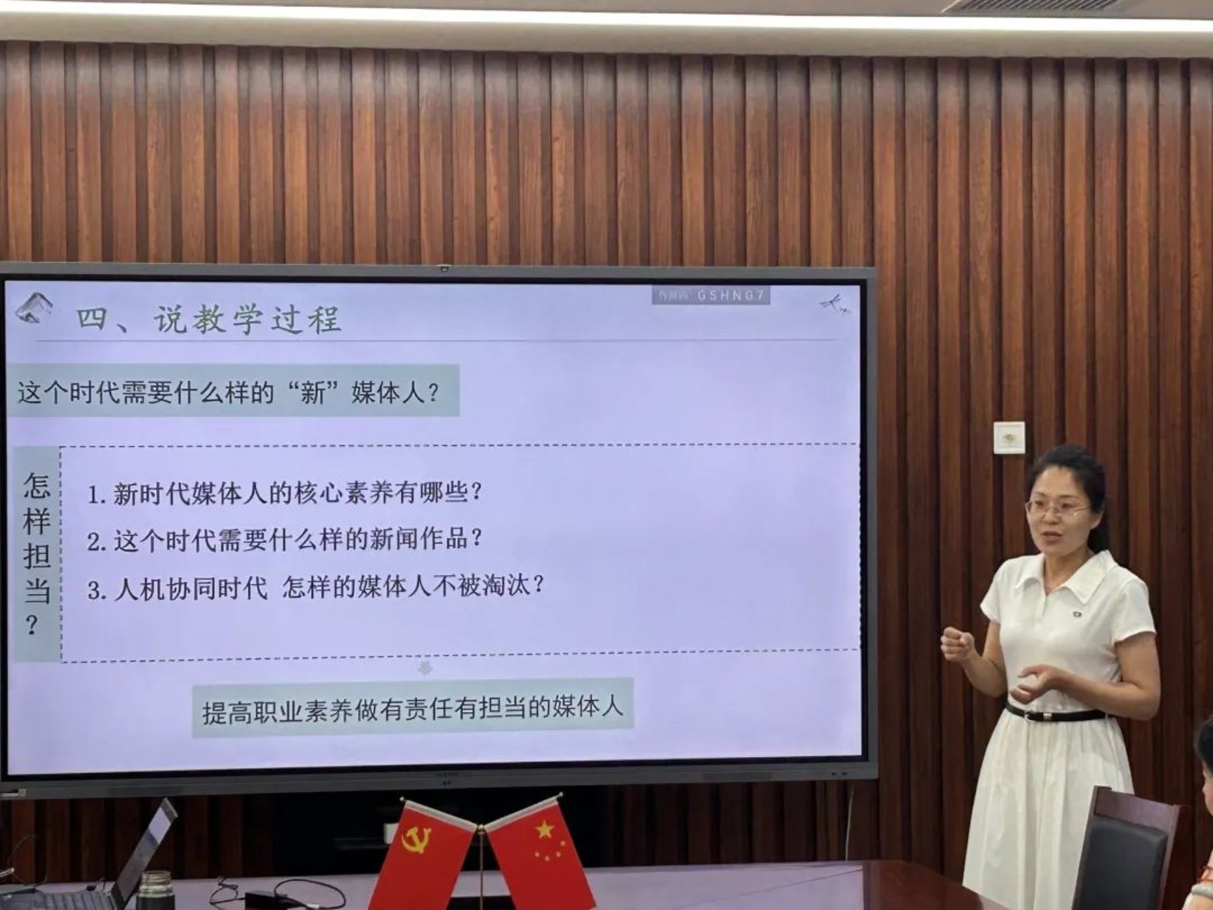 姜茹茹聚焦如何给“新传”专业学生讲好“时代责任担当”。她从教材内容、学生学情和教学过程三个方面展开,在教材内容方面,将绪论中标题结合新闻传播专业进行转换;在学生学情分析上,涵盖了学生知识基础、能力基础以及情感价值观情况;在教学过程中,将党的十九大报告提出的,中华民族迎来了站起来、富起来、强起来的伟大飞跃,以更易于新传学生接受的方式开展教学。